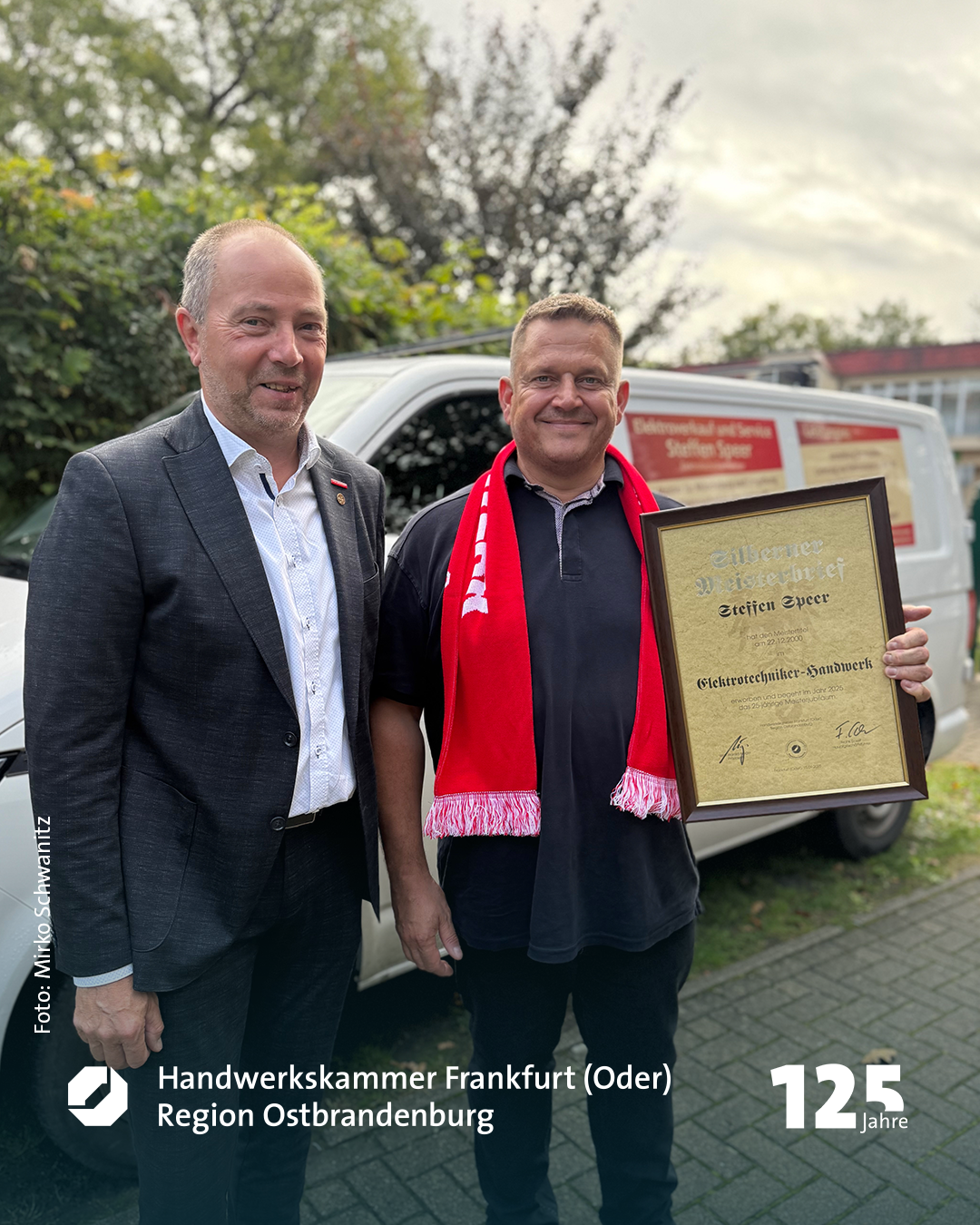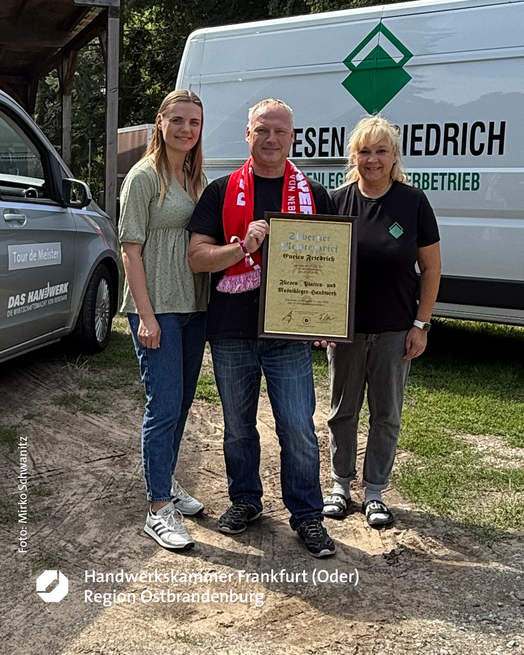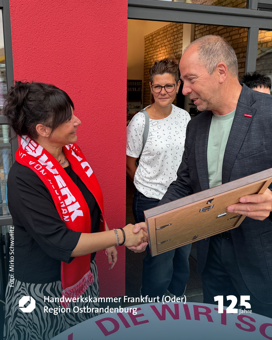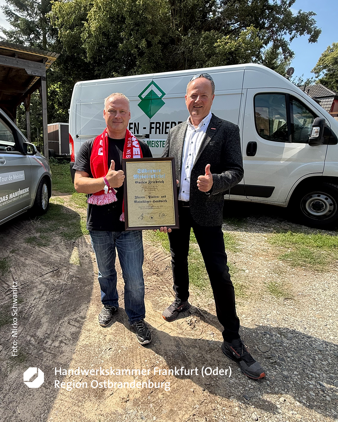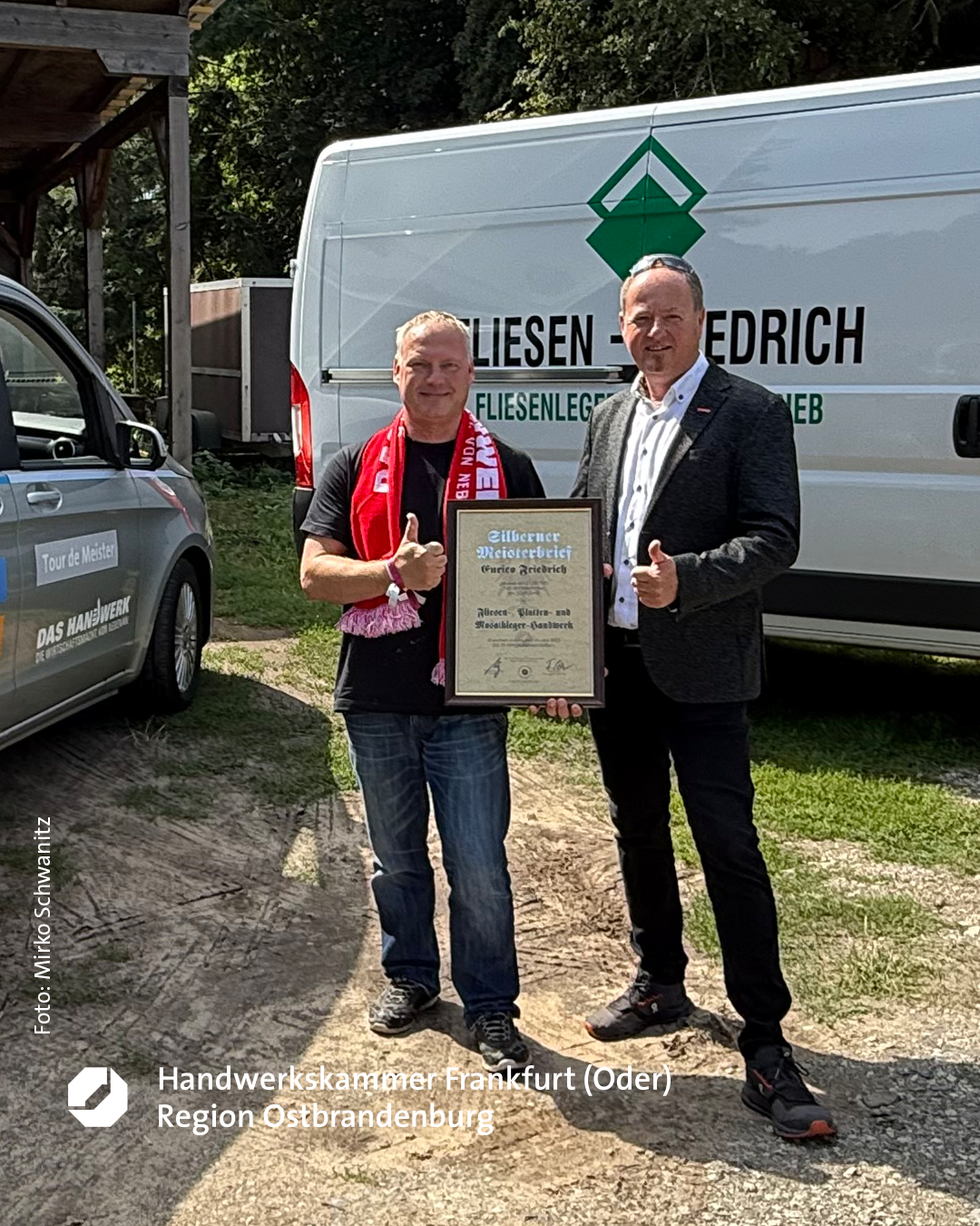 Auch in diesem Jahr macht sich das Meistermobil wieder auf den Weg im Kammerbezirk! Besucht werden Handwerker und Handwerkerinnen, die im Jahr 2000 ihre Meisterprüfung abgelegt und den Antrag gestellt haben. Für 2025 gibt es 103 Anspruchsberechtigte, die im Januar per Brief informiert wurden. Mit der Rückmeldung besteht die Möglichkeit der persönlichen Übergabe oder einer Zusendung per Post. 67 haben sich gemeldet, davon machen 31 vom Angebot Gebrauch, den Silbernen Meisterbrief vom Präsidenten oder Hauptgeschäftsführer der Kammer, persönlich entgegen zu nehmen. Die Tour de Meister führt in die Betriebe vor Ort, um gleichzeitig Wünsche und Problemlagen besprechen zu können. Von Juni bis Oktober geht es durch Ostbrandenburg. Hier erste Impressionen: