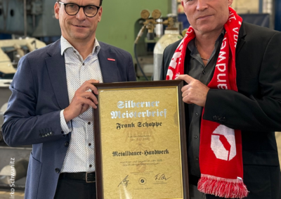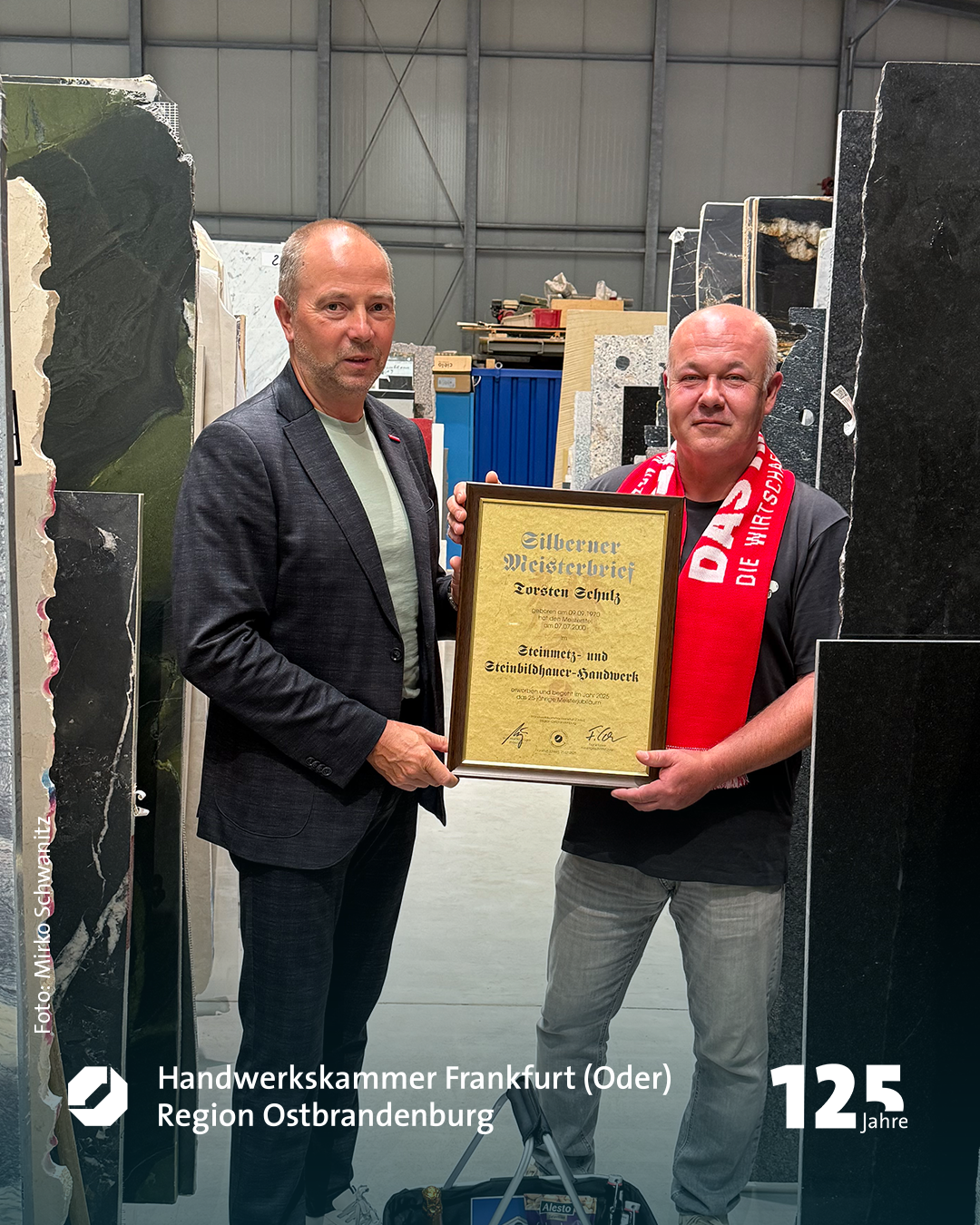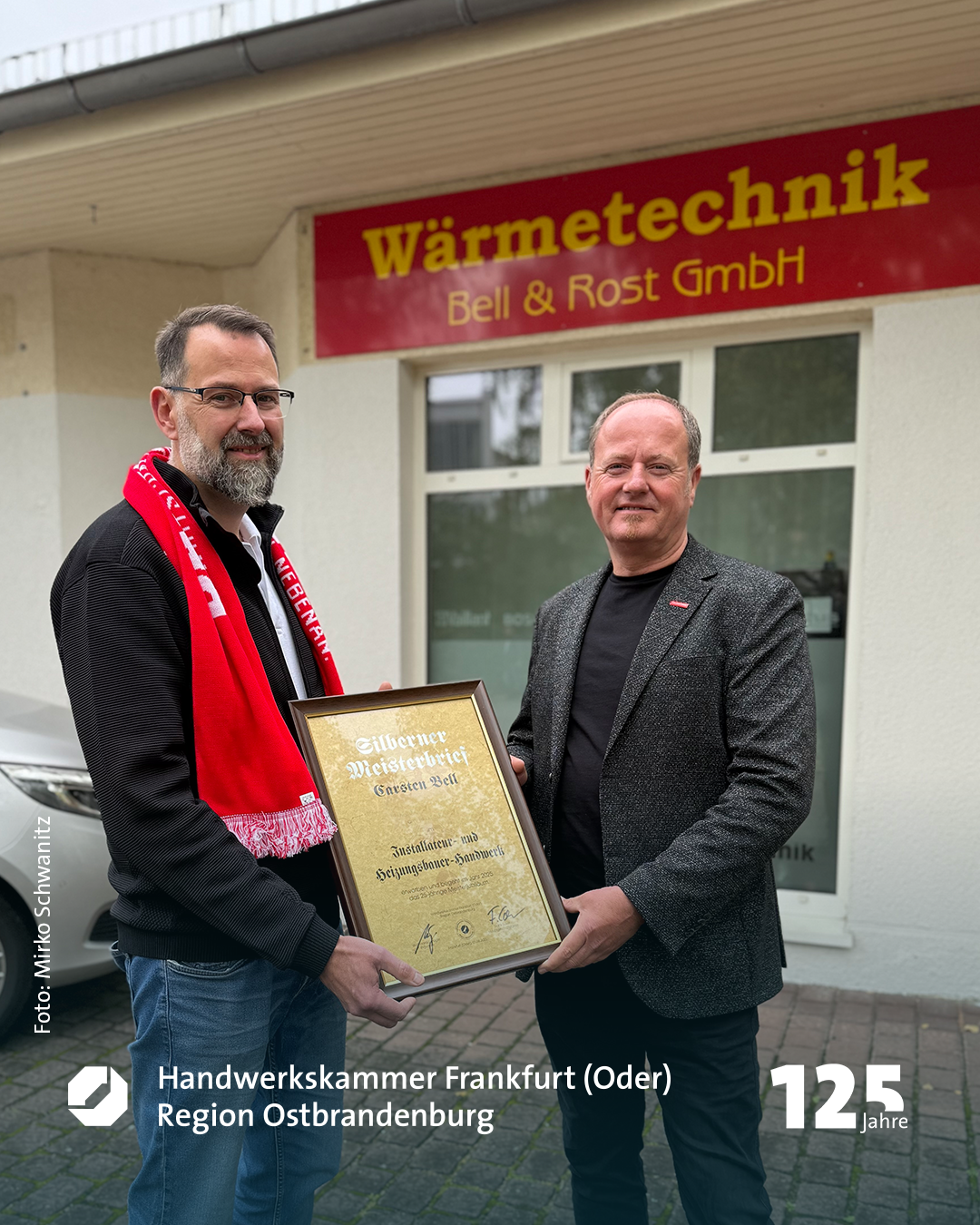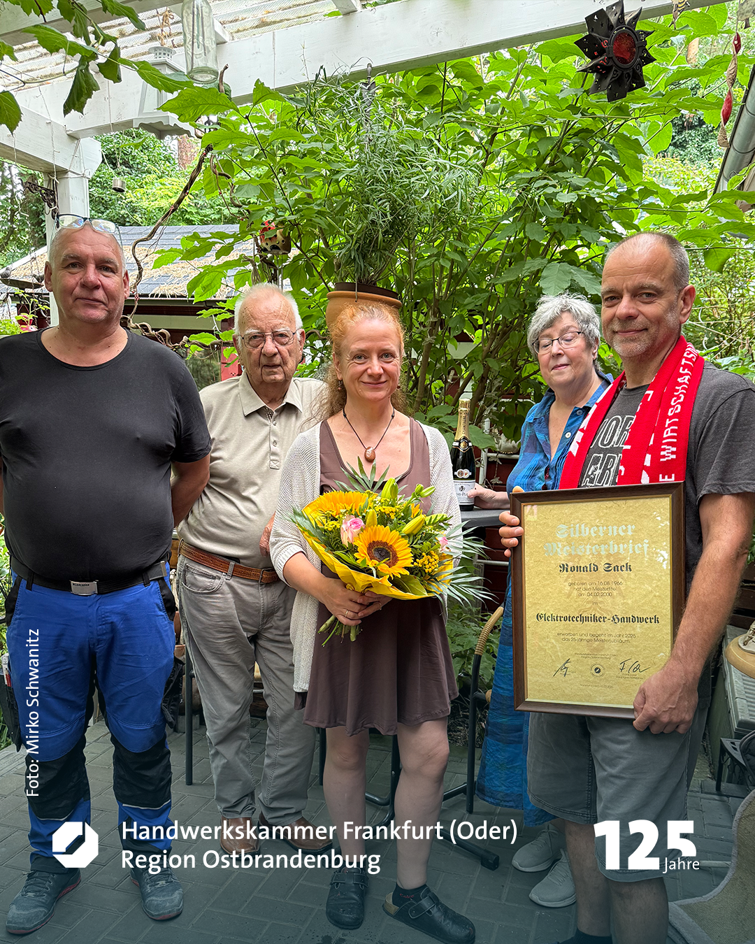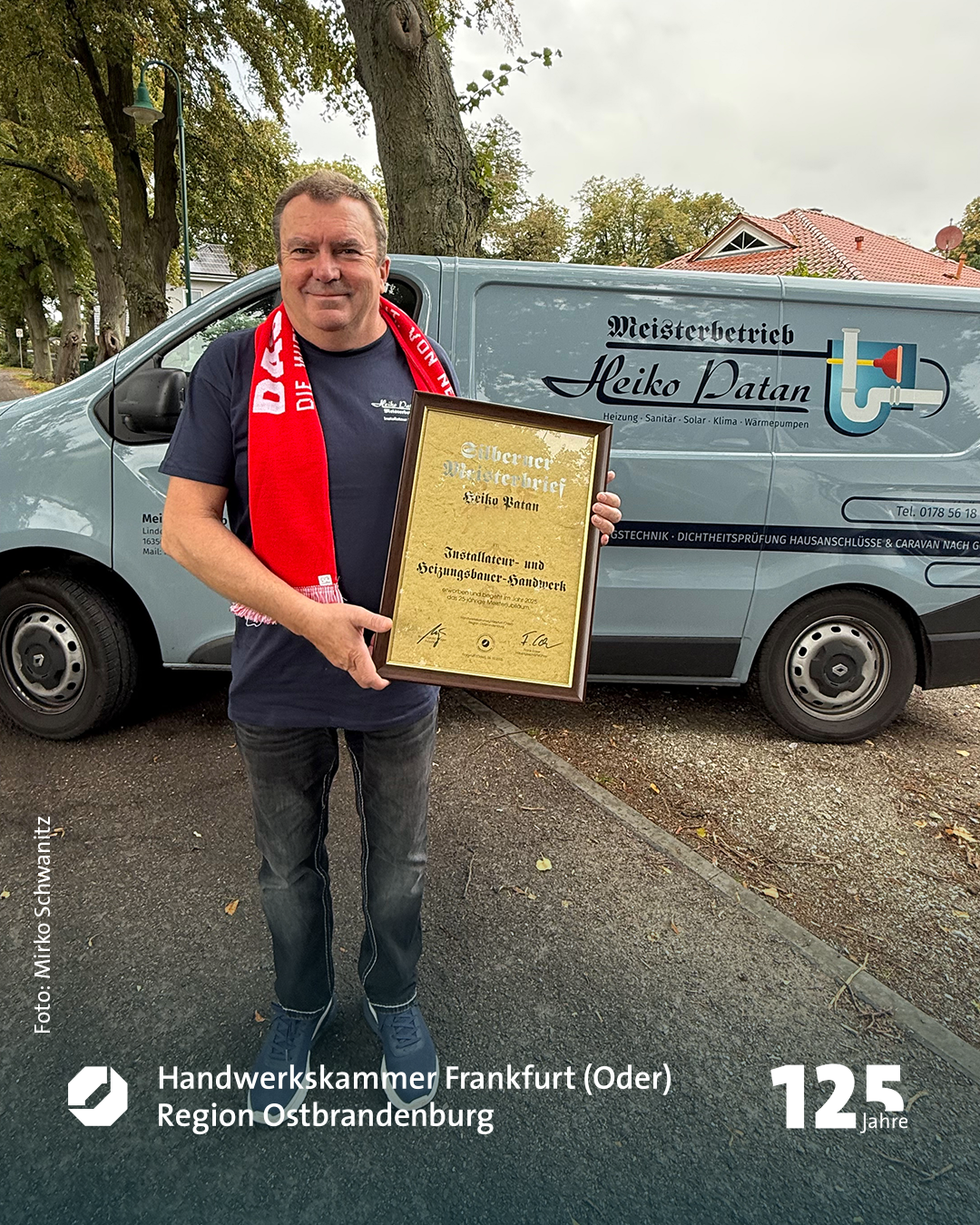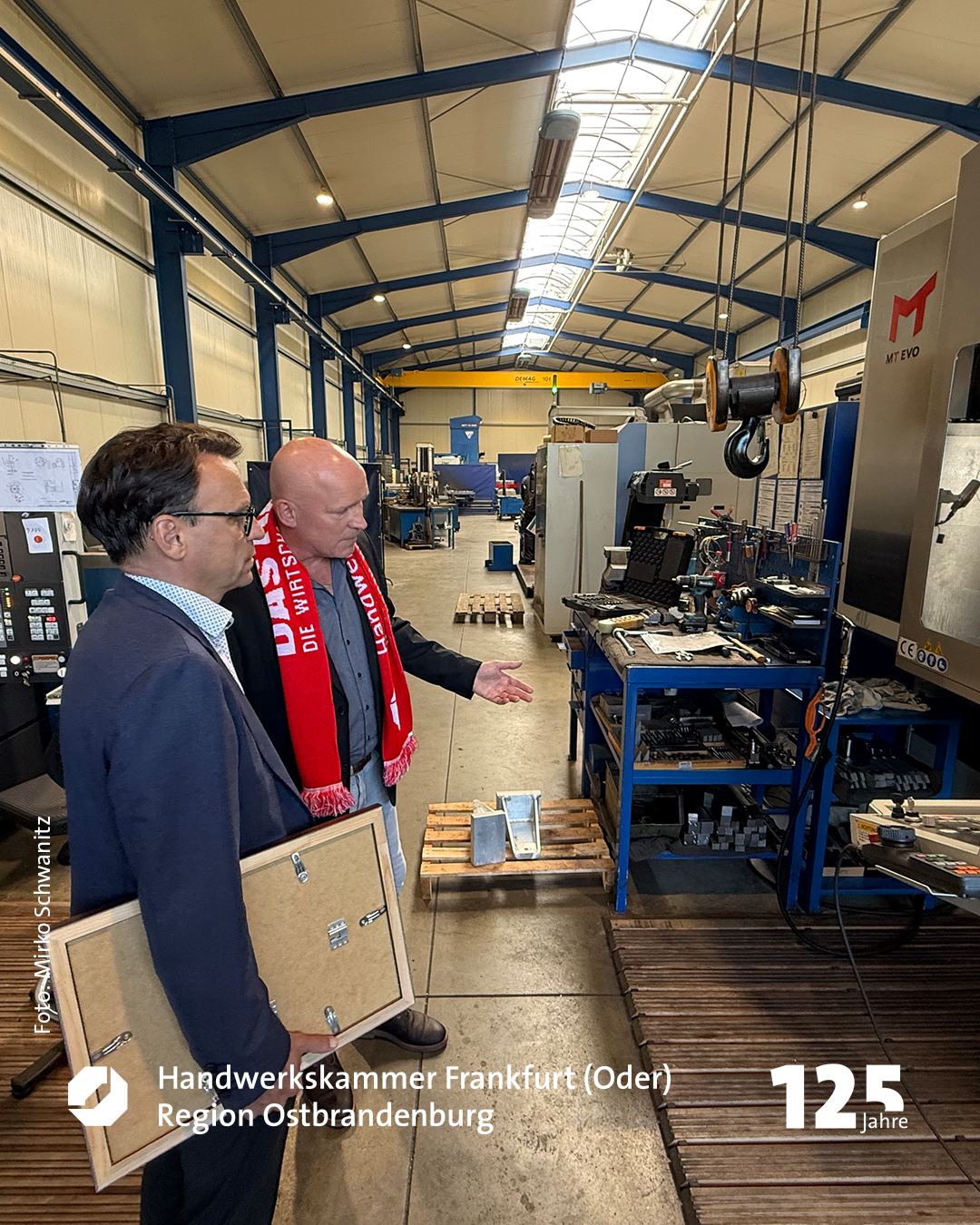 Auch in diesem Jahr macht sich das Meistermobil wieder auf den Weg im Kammerbezirk! Besucht werden Handwerker und Handwerkerinnen, die im Jahr 2000 ihre Meisterprüfung abgelegt und den Antrag gestellt haben. Für 2025 gibt es 103 Anspruchsberechtigte, die im Januar per Brief informiert wurden. Mit der Rückmeldung besteht die Möglichkeit der persönlichen Übergabe oder einer Zusendung per Post. 67 haben sich gemeldet, davon machen 31 vom Angebot Gebrauch, den Silbernen Meisterbrief vom Präsidenten oder Hauptgeschäftsführer der Kammer, persönlich entgegen zu nehmen. Die Tour de Meister führt in die Betriebe vor Ort, um gleichzeitig Wünsche und Problemlagen besprechen zu können. Von Juni bis Oktober geht es durch Ostbrandenburg. Hier erste Impressionen: