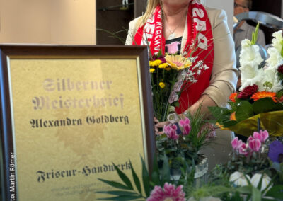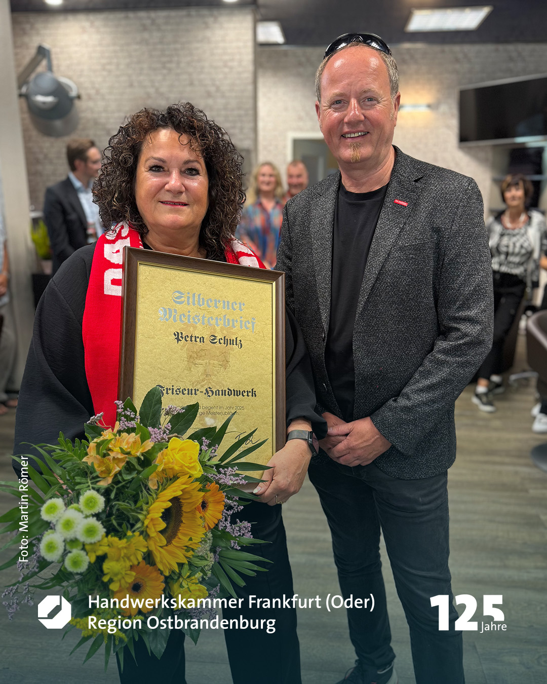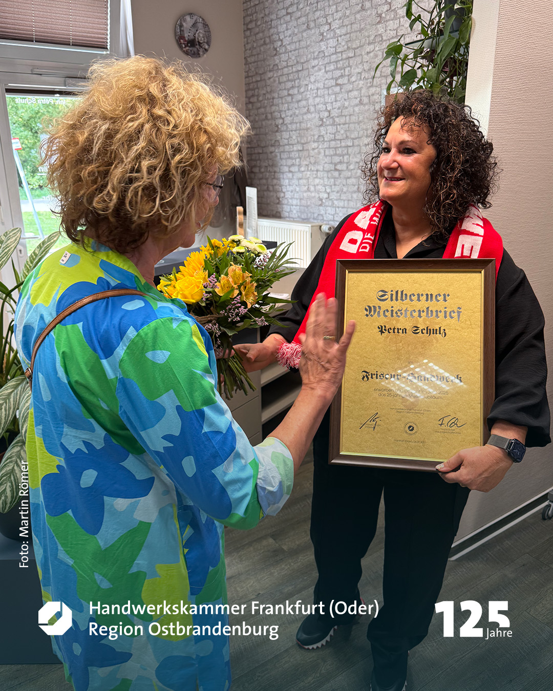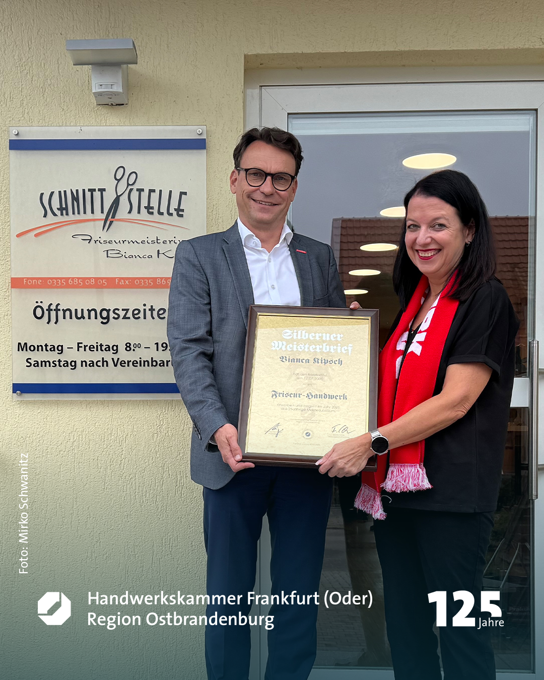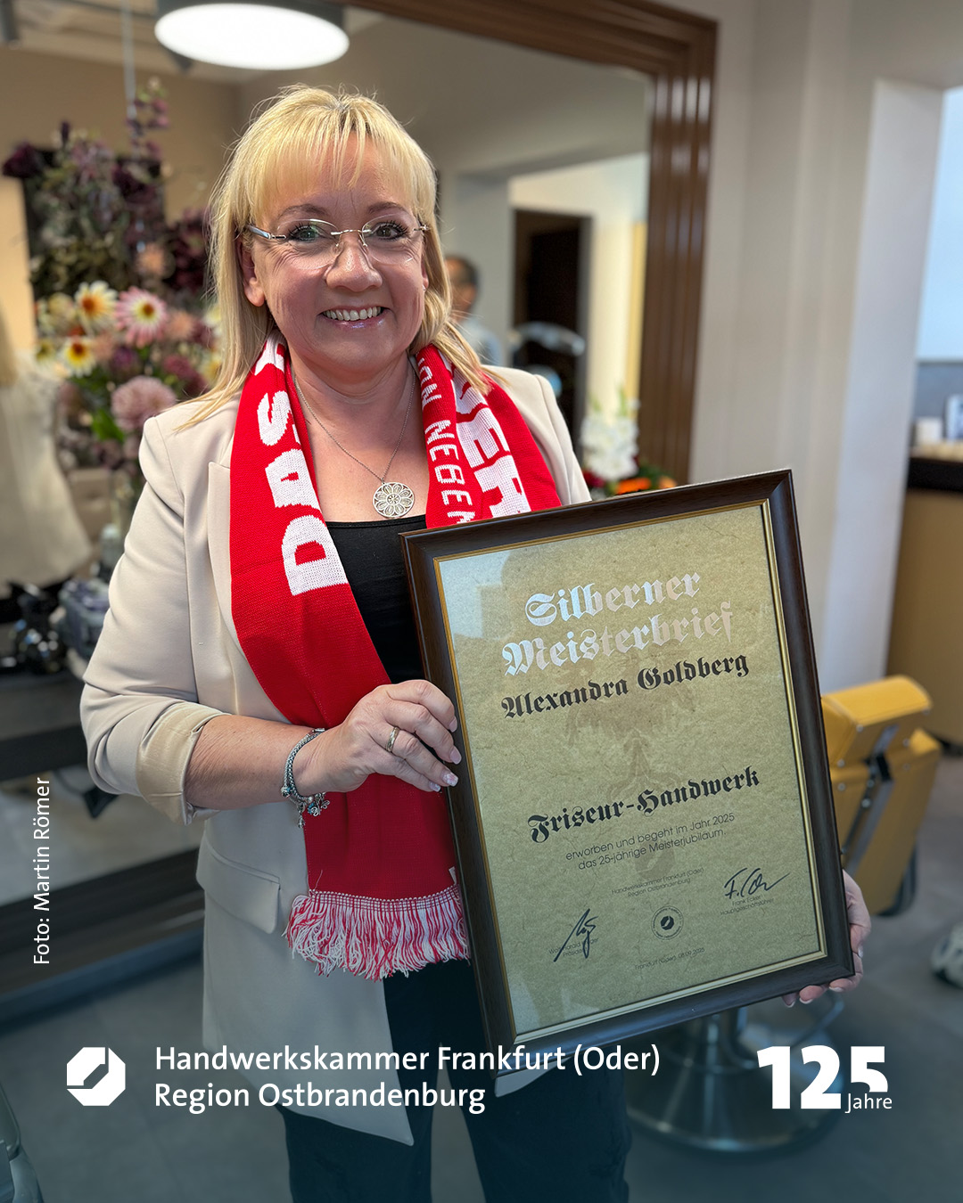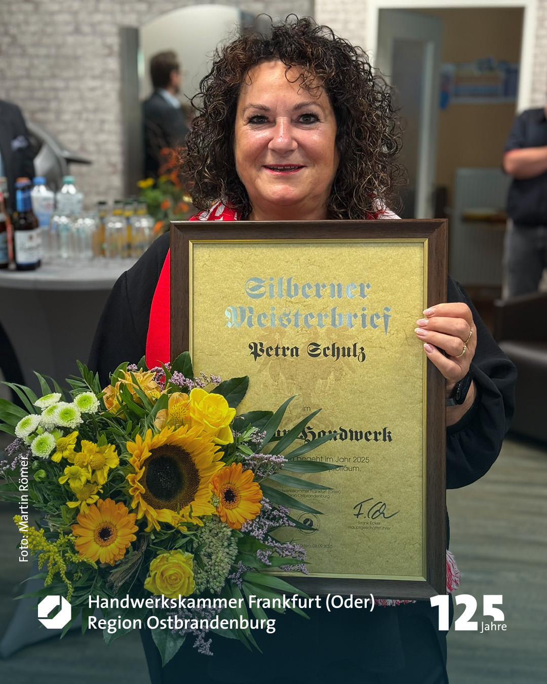 Der Silberne Meisterbrief wird an Handwerksmeister verliehen, die mit ihrem Unternehmen als Mitglied der Handwerkskammer Frankfurt (Oder) – Region Ostbrandenburg eingetragen sind und im Jahr der Antragsstellung ihr 25-jähriges Meisterjubiläum begehen. Die Handwerkskammer prüft das Vorliegen der Voraussetzungen grundsätzlich von Amts wegen. Darüber hinaus kann die Auszeichnung auf Antrag auch den in Mitgliedsunternehmen der Handwerkskammer angestellten Handwerksmeistern, die im betreffenden Jahr ihr Silbernes Meisterjubiläum begehen, verliehen werden. Die Verleihung ist nicht von einer ehrenamtlichen Tätigkeit im Handwerk abhängig. Bei Fragen hilft Silke Köppen.