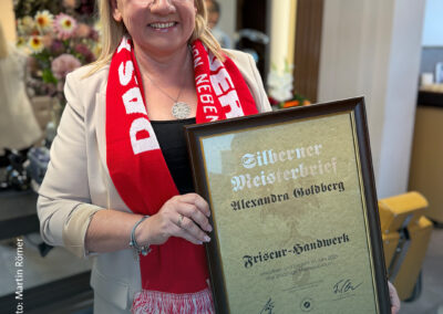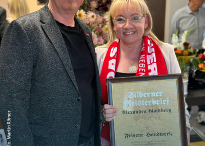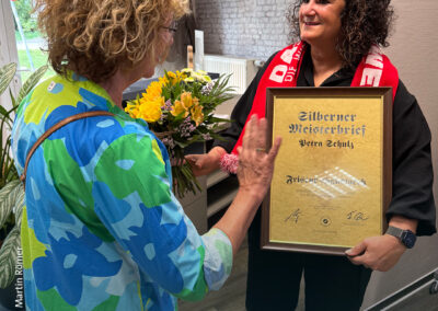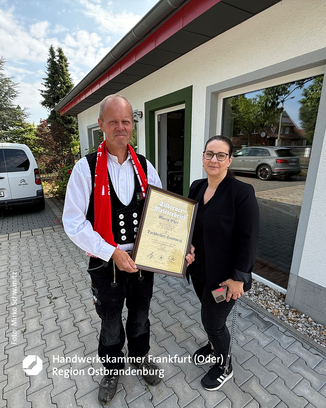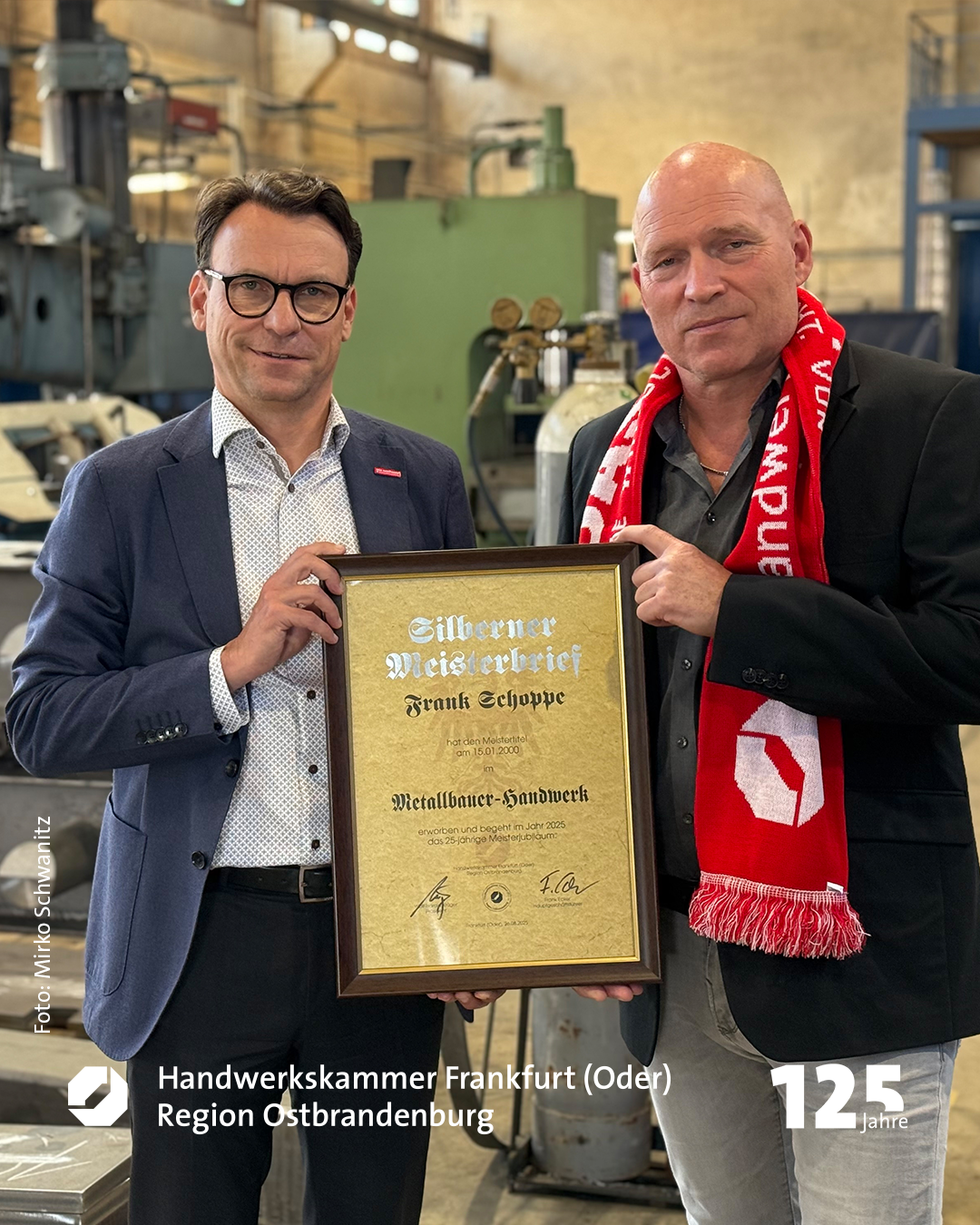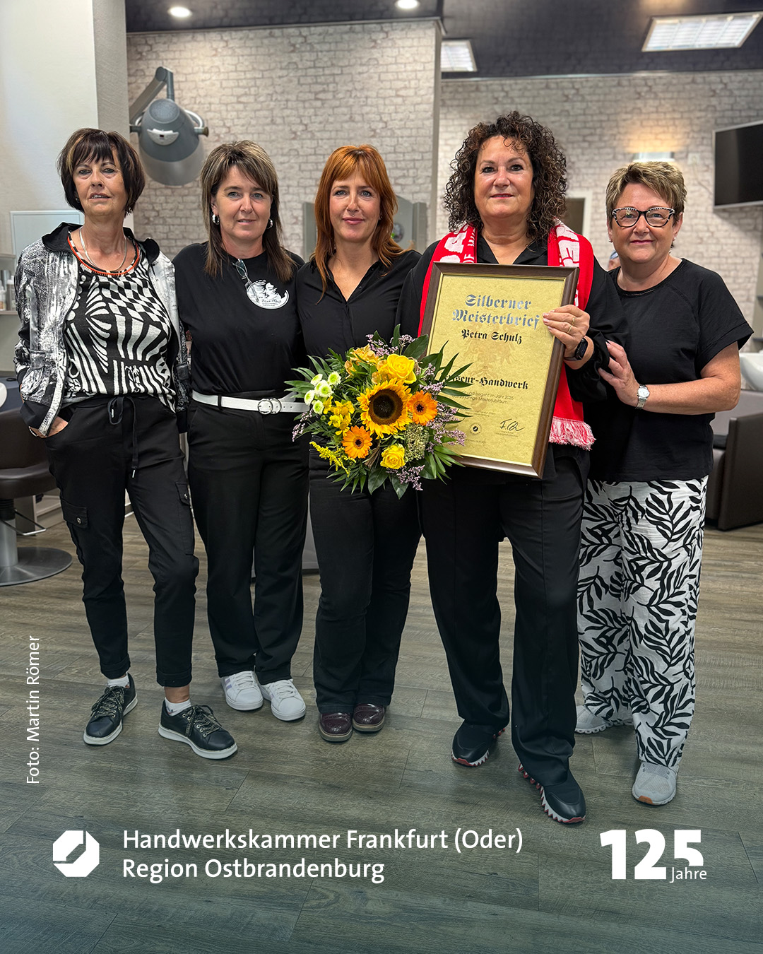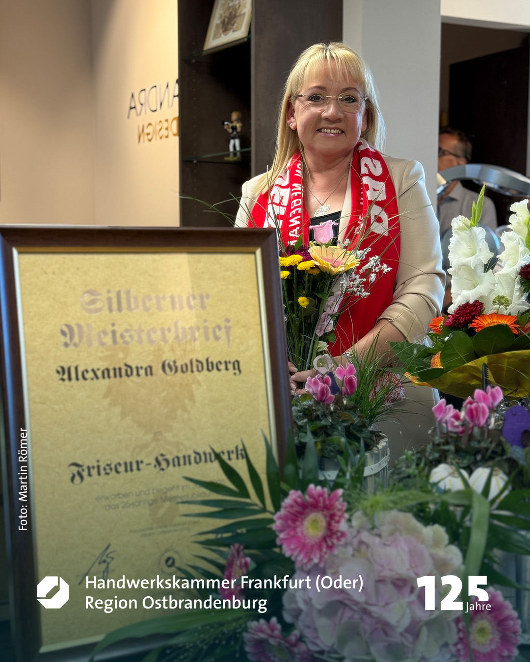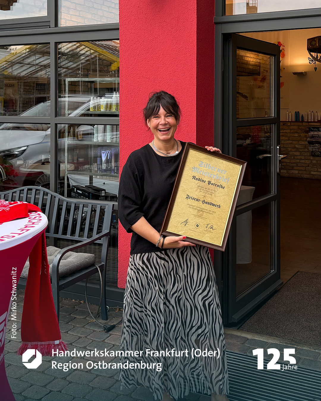 Der Silberne Meisterbrief wird an Handwerksmeister verliehen, die mit ihrem Unternehmen als Mitglied der Handwerkskammer Frankfurt (Oder) – Region Ostbrandenburg eingetragen sind und im Jahr der Antragsstellung ihr 25-jähriges Meisterjubiläum begehen. Die Handwerkskammer prüft das Vorliegen der Voraussetzungen grundsätzlich von Amts wegen. Darüber hinaus kann die Auszeichnung auf Antrag auch den in Mitgliedsunternehmen der Handwerkskammer angestellten Handwerksmeistern, die im betreffenden Jahr ihr Silbernes Meisterjubiläum begehen, verliehen werden. Die Verleihung ist nicht von einer ehrenamtlichen Tätigkeit im Handwerk abhängig. Bei Fragen hilft Silke Köppen.