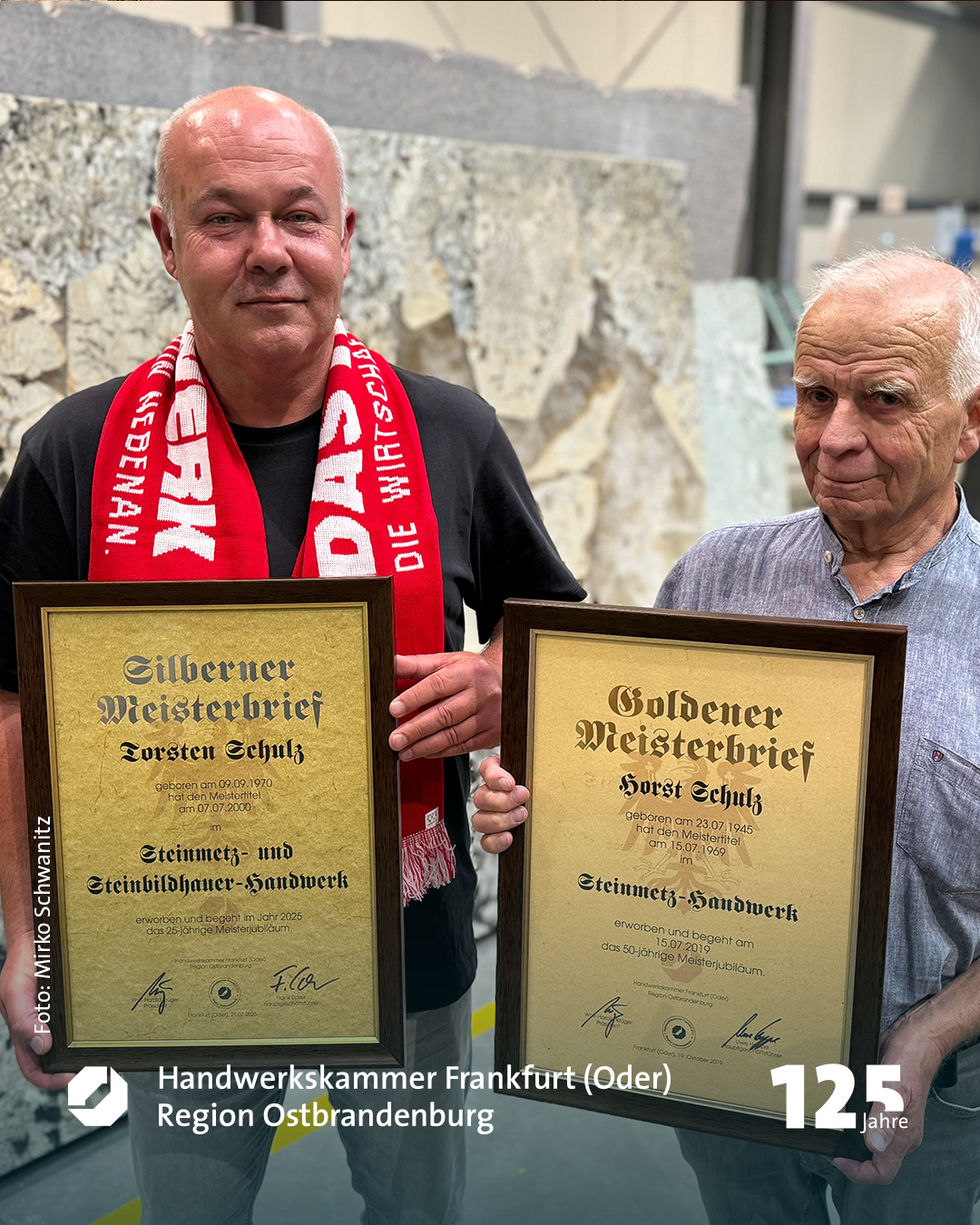 Jährlich ehren wir diejenigen, die vor 50 oder 25 Jahren ihre Meisterausbildung abgeschlossen haben mit der Übergabe des Silbernen und Goldenen Meisterbriefes. Alle Personen, die ihr Jubiläum im jeweils laufenden Kalenderjahr begehen, bekommen den Silbernen oder Goldenden Meisterbrief auf der im selben Jahr stattfindenden feierlichen Meisterbriefübergabe überreicht. Wenn gewünscht, wird die Urkunde aber auch mit der Post zugestellt. Die Ausfertigung ist kostenfrei. Eine Verleihung postum ist unter bestimmten Umständen möglich.