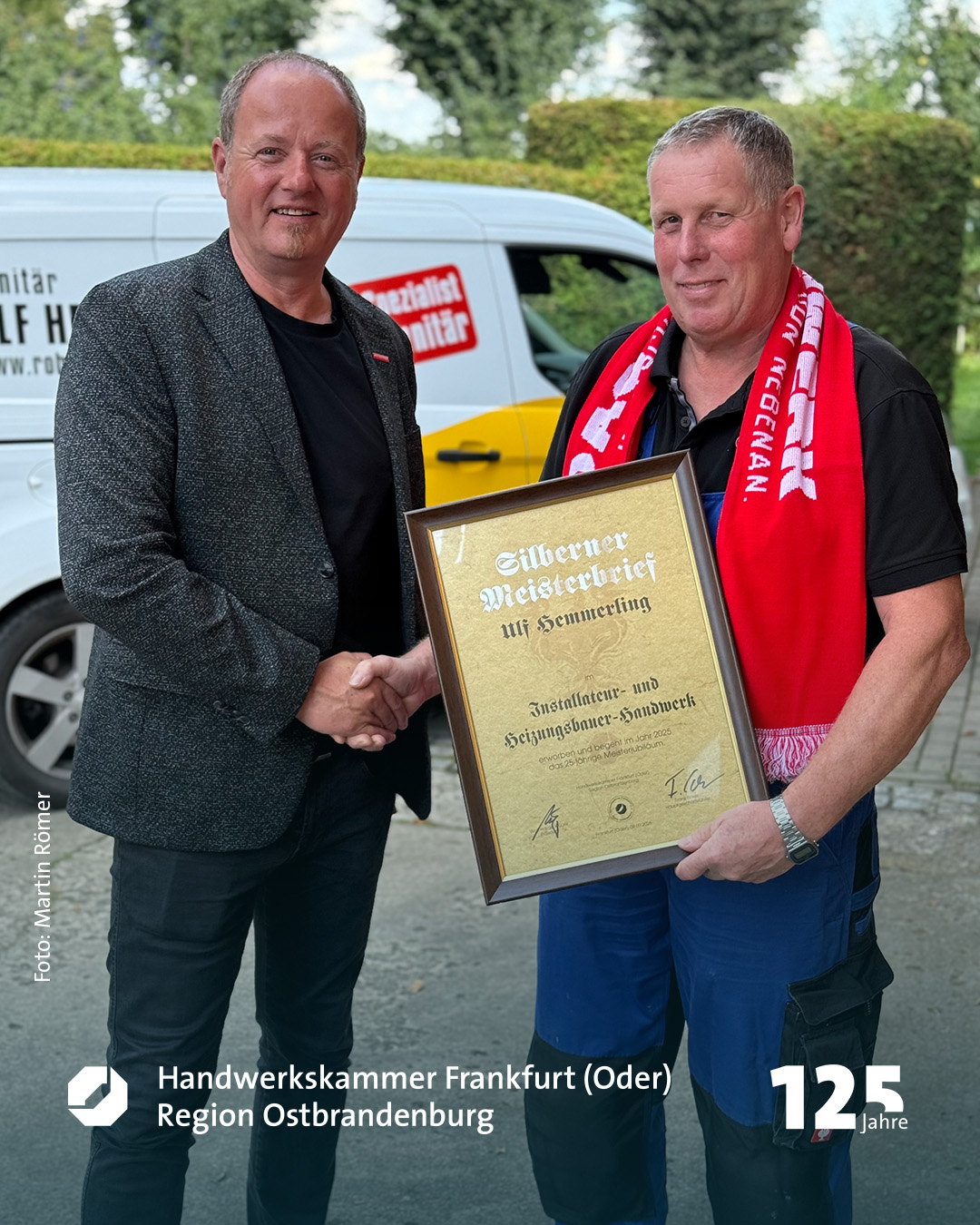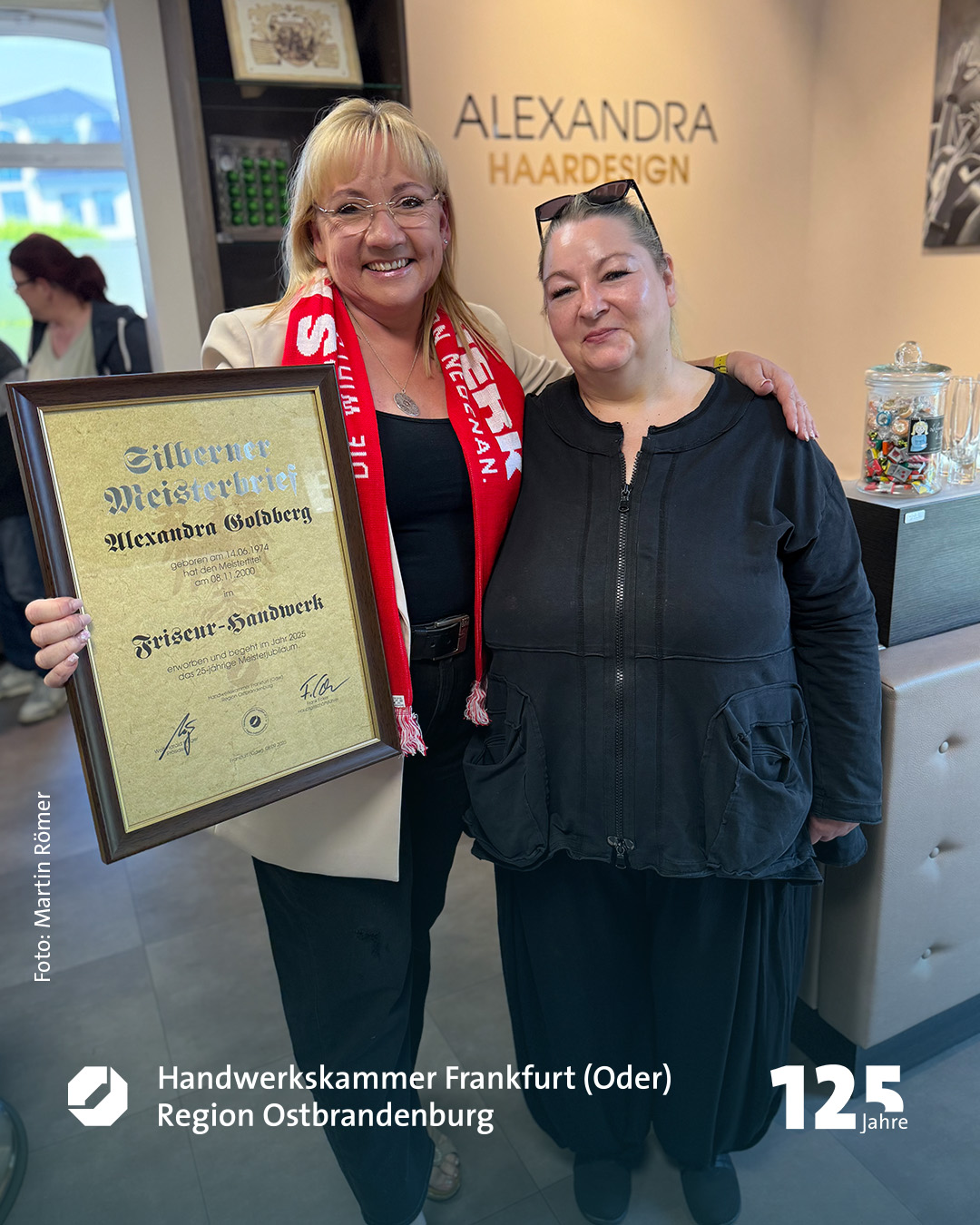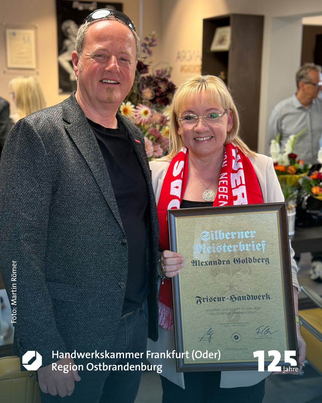Auch in diesem Jahr macht sich das Meistermobil wieder auf den Weg im Kammerbezirk! Besucht werden Handwerker und Handwerkerinnen, die im Jahr 2000 ihre Meisterprüfung abgelegt und den Antrag gestellt haben. Für 2025 gibt es 101 Anspruchsberechtigte, die im Januar per Brief informiert wurden. Mit der Rückmeldung besteht die Möglichkeit der persönlichen Übergabe oder einer Zusendung per Post. 65 haben sich gemeldet, davon machen 30 vom Angebot Gebrauch, den Silbernen Meisterbrief vom Präsidenten oder Hauptgeschäftsführer der Kammer, persönlich entgegen zu nehmen. Die Tour de Meister führt in die Betriebe vor Ort, um gleichzeitig Wünsche und Problemlagen besprechen zu können. Von Juni bis Oktober geht es durch Ostbrandenburg. Hier erste Impressionen: