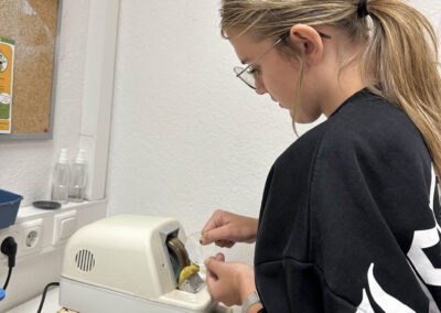 Besonders Samira und Julia nahmen sich der Schüler an. „Die Brille ist ein Medizinprodukt und wird individuell angepasst“, so Samira. Beide erklärten anschaulich, wie die Netzhaut funktioniert und warum z. B. bei den Großeltern oft Augenoperationen vorgenommen werden müssen, am Beispiel von Gummibären und deren Konsistenz. Einen Einblick gab es auch in die Nutzung der hochmodernen Geräte und Prüfplätze sowie in den Ablauf der Kundenberatung. Julia: „Wir sind die Schnittstelle zwischen Augenarzt und Kunde. Nicht selten erklären wir Befunde, weil in den Arztpraxen die Zeit für den Patienten oft fehlt.“ Hier jedoch nimmt man sich die Zeit, um mit und für den Kunden eine optimale Sehunterstützung zu erreichen. Samira hat durch regelmäßige Praktika schon recht früh Gefallen an dem Beruf gefunden und durch ihr Abitur die Möglichkeit genutzt, verkürzt zu lernen. „In der Ausbildung wird einem vieles beigebracht. Hier haben wir aber die Möglichkeit, uns zu spezialisieren und dann auch in dem Bereich zu arbeiten.“ Anschließend ging es noch an die praktische Arbeit, die Fertigung von Brillenglasschablonen aus Kunststoff und das Schleifen von Brillengläsern. Das Ergebnis wurde zum Schluss in ein Brillengestell eingepasst. „Spannend zu sehen, wie eine Brille entsteht!“, meinte Ronja am Ende. So spannend hatten sich alle Vier den Vormittag nicht vorgestellt.