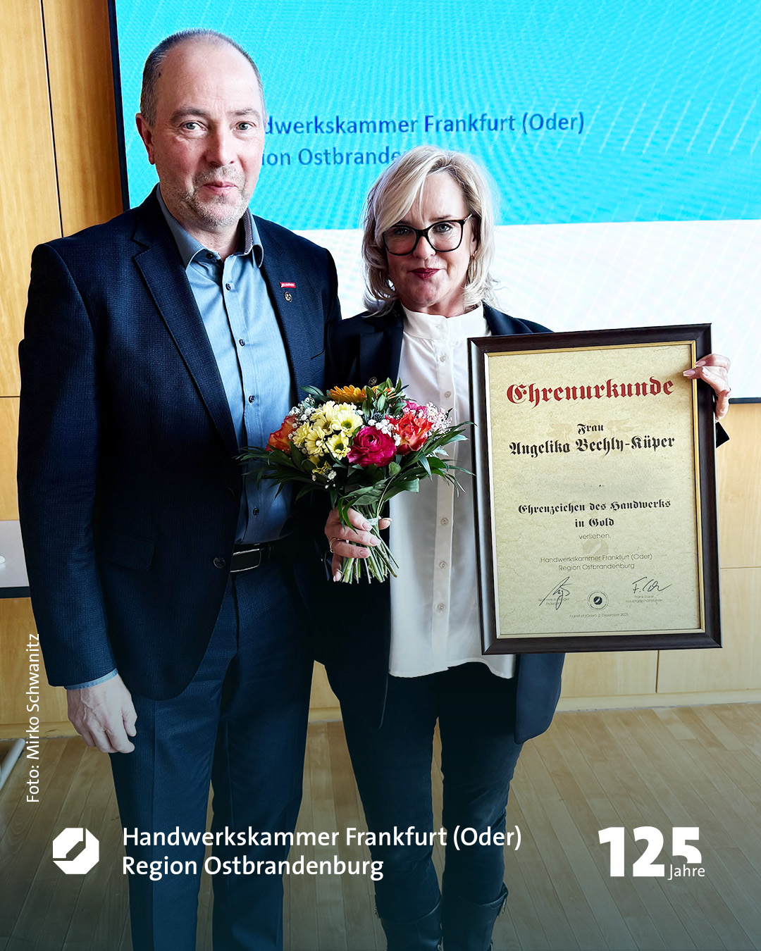 Ein besonderer Höhepunkt war die Anerkennung des langjährigen Einsatzes von Friseurmeisterin Angelika Bechly-Küper aus der Uckermark. Sie wurde für ihr über Jahrzehnte hinweg anhaltendes ehrenamtliches Wirken im Handwerk ausgezeichnet.