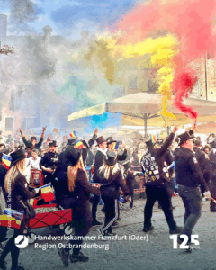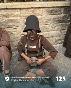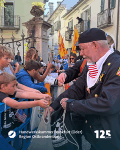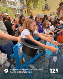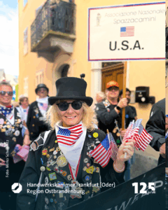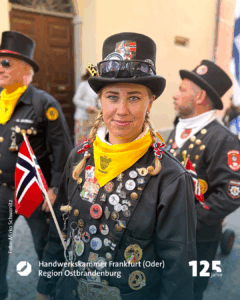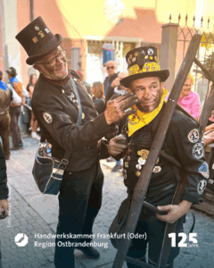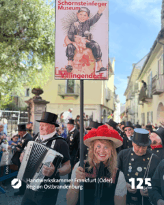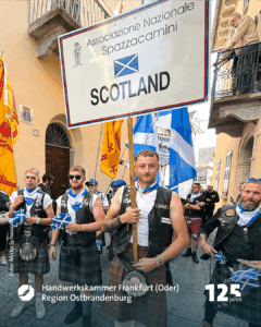 Marko Dorndorf ist der Wortführer der sechs Freunde, die gerade mit einem kleinen Wagen, in dem ein riesiger weißer Teddybär sitzt, durch die Fußgängerzone Richtung Schornsteinfegermuseum bollern. Schornsteinfegermeister Tobias Wieth hat Frau Heike mitgebracht, Meister Christian Becker seine Frau Nora. Auch Kollege Philipp Stupperich ist dabei. Auf dem Wagen prangt die Aufschrift „Glückstour 2025“. Die schwarzen Kluften sind geschmückt mit bunten Stickern. Goldene Knöpfe blitzen in der Morgensonne. Aufnäher zeigen: die sechs kommen aus dem Lahn-Dill-Kreis. Witze fliegen hin und her, einer spielt dem anderen den „Ball“ zu. Die Fröhlichkeit steckt an. Sie spiegelt die Seele des größten und einzigen Welttreffens eines Handwerks. „Die Faszination, dass, was uns hier immer wieder hertreibt, lässt sich für Außenstehende nur schwer beschreiben“, meint Marko Dorndorf, Schornsteinfegermeister aus Eschenburg. „Es ist wie eine Droge. Es macht süchtig“, lacht er.