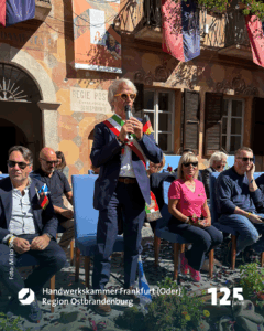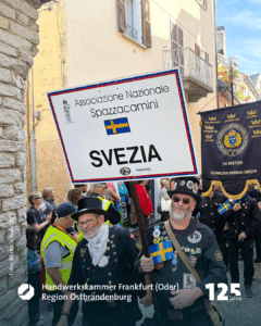 Alberto Morosin findet die schiere Größe des Treffens erstaunlich. Schließlich sei der ausrichtende italienische Verband ja gar nicht groß. Er selbst ist der einzige selbstständige Schornsteinfeger im Ossola-Tal, das sich mit seinen angeschlossenen Tälern Antrona, Anzasca, Bognanco, Divedro, Isorno, Vigezzo, Antigorio und Formazza, vom Lago Maggiore bis zu den majestätischen Viertausendern an der Schweizer Grenze zieht. „Hier und in ganz Italien,“ erklärt mir Alberto, „ist Schornsteinfeger kein Ausbildungsberuf. Man kann angelernt werden. Dann macht man den Beruf einfach. Ich komme aus einer einfachen Familie aus der Nähe von Mailand. Studieren kam aus finanziellen Gründen nicht in Frage. Also habe ich nach der Schule vieles gemacht. Dann ging ich in die Schweiz – wie viele Leute aus den Tälern hier. Mit der Simplon-Bahn bist du ruck zuck in Brigg. Mit der Centovalli-Bahn kommst du schnell nach Locarno. Viele pendeln mit dem Auto. Man verdient dort einfach mehr. In der Schweiz arbeitete ich als Gehilfe eines Schornsteinfegers. Ich entschied, mich dort professionell ausbilden zu lassen und dann nach Hause zurückzukehren.“ Unterstützung oder gar Förderung bei der Gründung seines Gewerbes gab es in der Heimat nicht. „Das Auto habe ich mir von meinem Ersparten gekauft. Die Technik auch. Eine im Kamin rotierende Bürste habe ich sogar selbst gebaut. Der Anfang war nicht leicht. Aber jetzt ist meine Auftragslage gut.“ 85.000 Euro Umsatz im zweiten Jahr seiner Selbstständigkeit. Das kann sich sehen lassen und ernährt Albertos kleine Familie. „Der Schweizer Gesellenbrief öffnet einem hier viele Türen. Der gilt was. Wer einen Schornsteinfeger googelt, der findet mich.“ Alberto wird in diesem Jahr nicht am Schornsteinfegertreffen teilnehmen können. „Ein echter Verlust“, findet er. Warum? „Weil ich viele Freunde und Kollegen in diesem Jahr nicht sehen werde.“