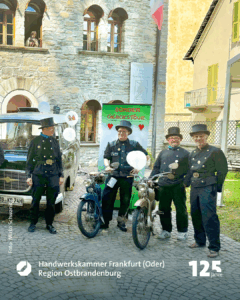 Mice Woelk aus Neuruppin in Mecklenburg-Vorpommern sitzt glücklich auf dem Sattel seines alten, einst in der DDR gebauten S2-Mopeds. Mehr als 1500 Kilometer liegen hinter dem Schornsteinfegermeister und seinen Gefährten, die jetzt ebenso knatternd und hupend wie er in den Park des Museo Spazzacamino einbiegen. Plötzlich brandet Beifall auf, Pfiffe der Anerkennung ertönen – ein paar hundert Berufskollegen sind gekommen, um den Tross zu begrüßen. Wie kann man auch nur auf so eine Idee kommen: Mit 5 PS-Gefährten von Neuruppin über Magdeburg, Erfurt, Aalen, Ravensburg, dem Schweizer Chur und dann über den San Bernardino-Pass bis nach Santa Maria-Maggiore zu fahren? Die Überraschung steht den Ankömmlingen ins Gesicht geschrieben. „Das hatte ich nicht erwartet“, freut sich Mice, der schon zum 30. Mal dabei ist. „Nur hier, in der Atmosphäre dieses Treffens, werden solch verrückte Ideen geboren“, sagt er. „Und dann gibt es immer welche, die mitmachen.“,