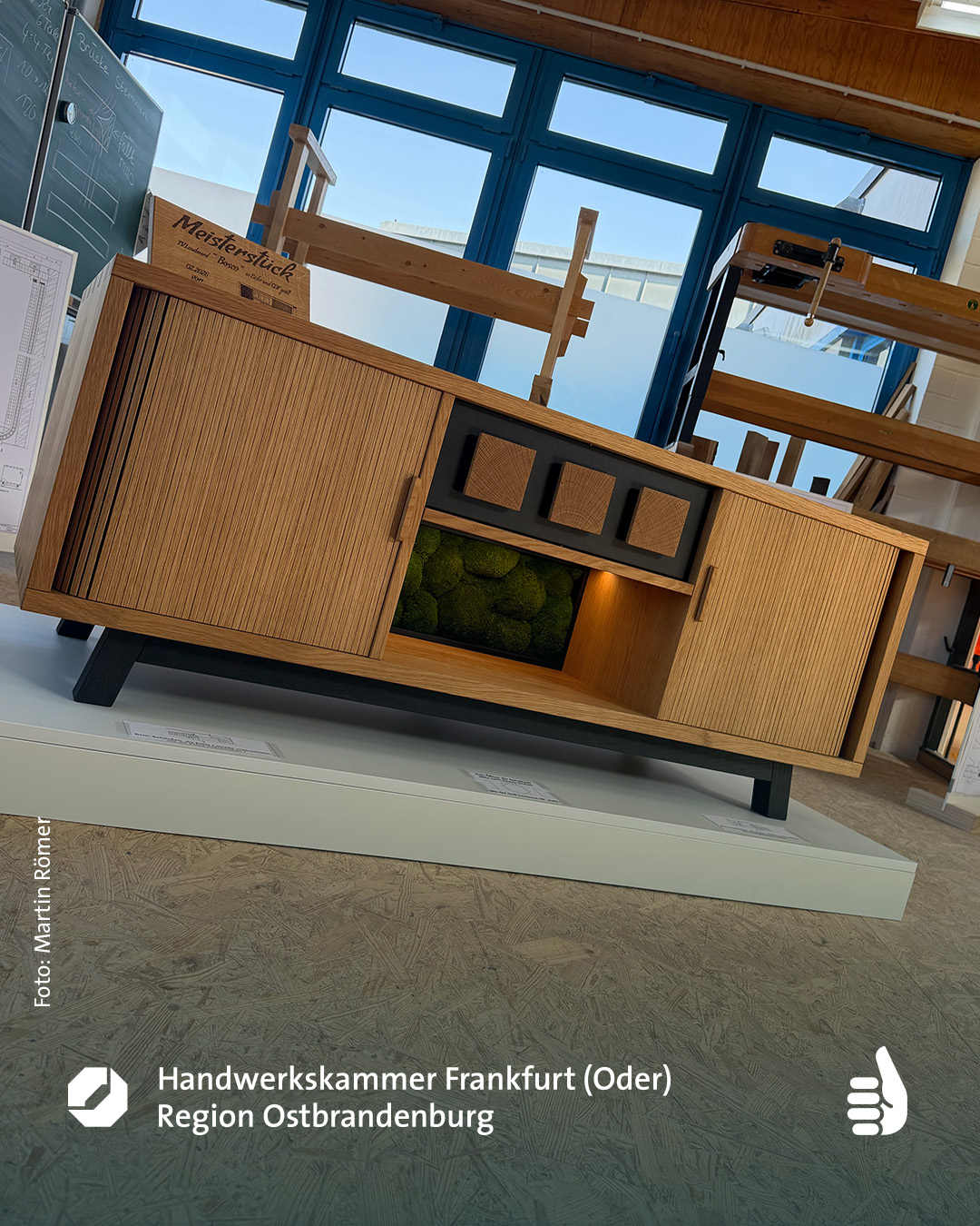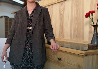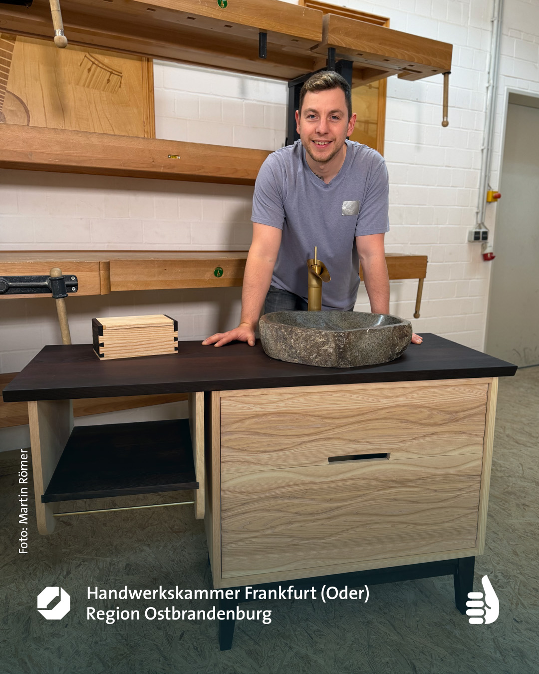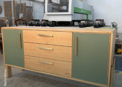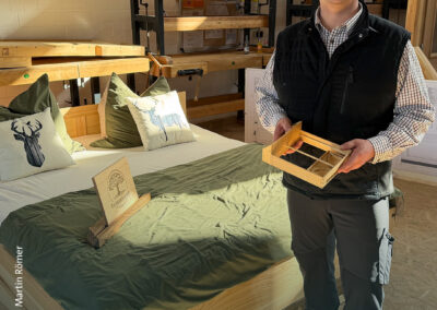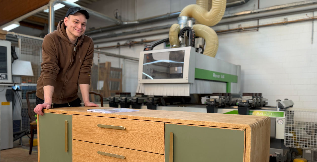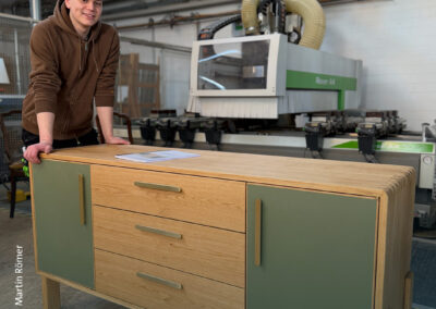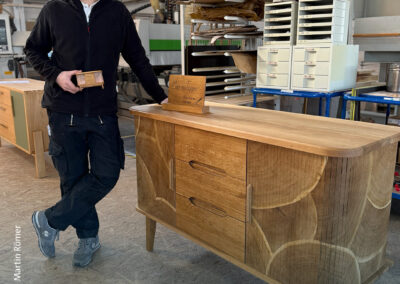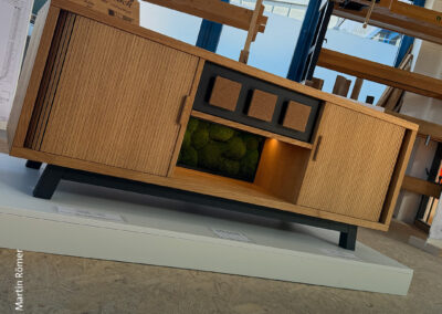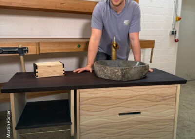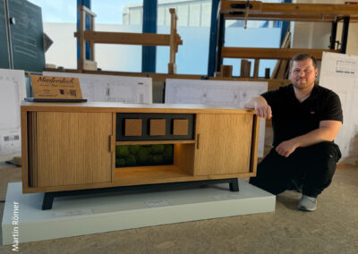 Sechs Meisterstücke mit Aha-Effekt – Marcus Wendelmuth schuf ein Möbel, »das frei im Raum stehen kann, von jeder Seite ansehnlich ist und mehr kann als ein gewöhnliches TV-Lowboard.« Hendrik Freier baute ein Bett für die eigene Dachschräge – mit ausziehbaren Nachtschränkchen. Niklas Fakler interpretierte mit seinem Sideboard aus Eiche den Look der 1950er-Jahre auf sehr moderne Weise. Robert Kielings Waschtisch aus Esche trägt ein Waschbecken aus altem Flussstein und birgt sein Geheimnis unter den Schubladen. Renée Kriegelstein entschied sich für eine elegante Frisierkommode mit eingelegter Labradorit-Platte. Wunderbar, aber sehr aufwändig, das mit chirurgischer Präzision geschnittene Hirnholzfurnier für die Rolltüren des Meisterstücks von Marius Tepper.