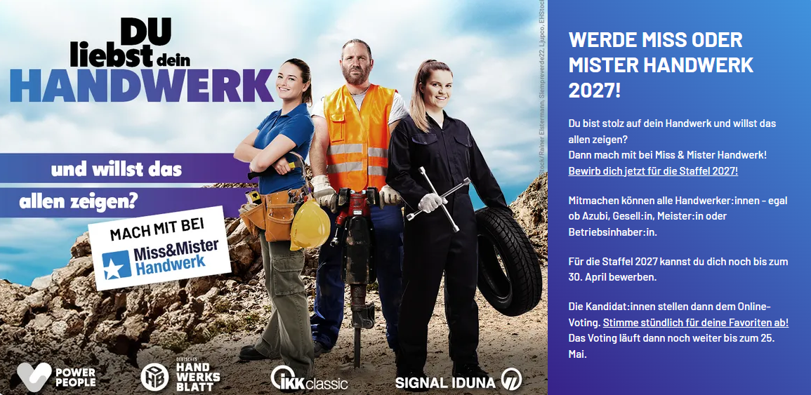 Der Wettbewerb will das Handwerk zusätzlich ins öffentliche Bewusstsein rücken, Werktätigen aus dem Handwerk ihre Bühne geben und vor allem junge Menschen für eine berufliche Zukunft im Handwerk begeistern. Wer mitmacht, hat die Chance auf den Titel Miss oder Mister Handwerk 2027 und auf ein Jahr voller spannender Erfahrungen als Botschafter des eigenen Berufs und des Handwerks insgesamt.