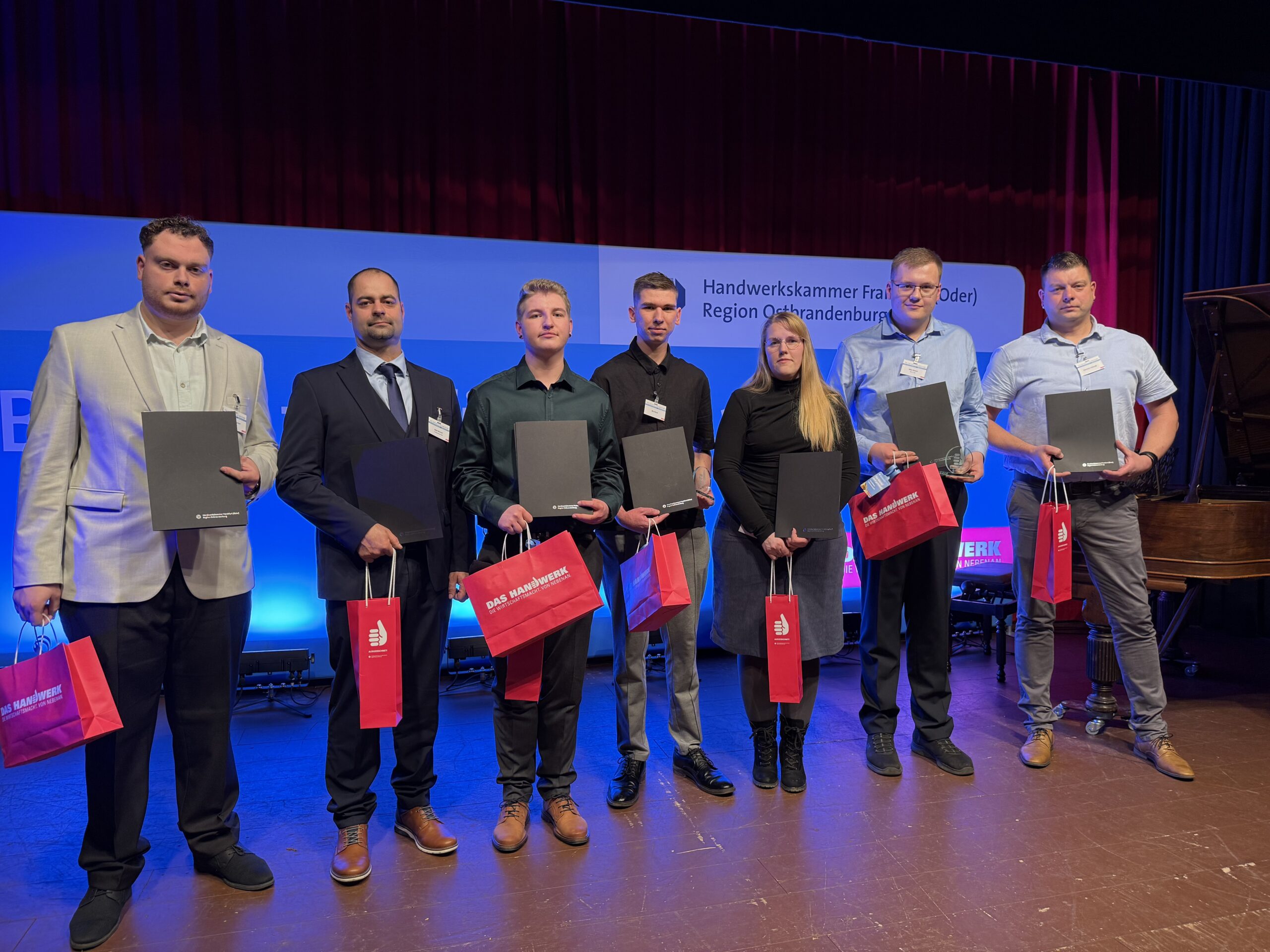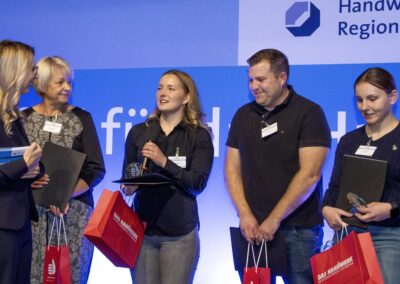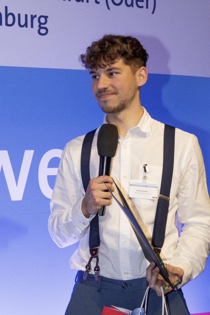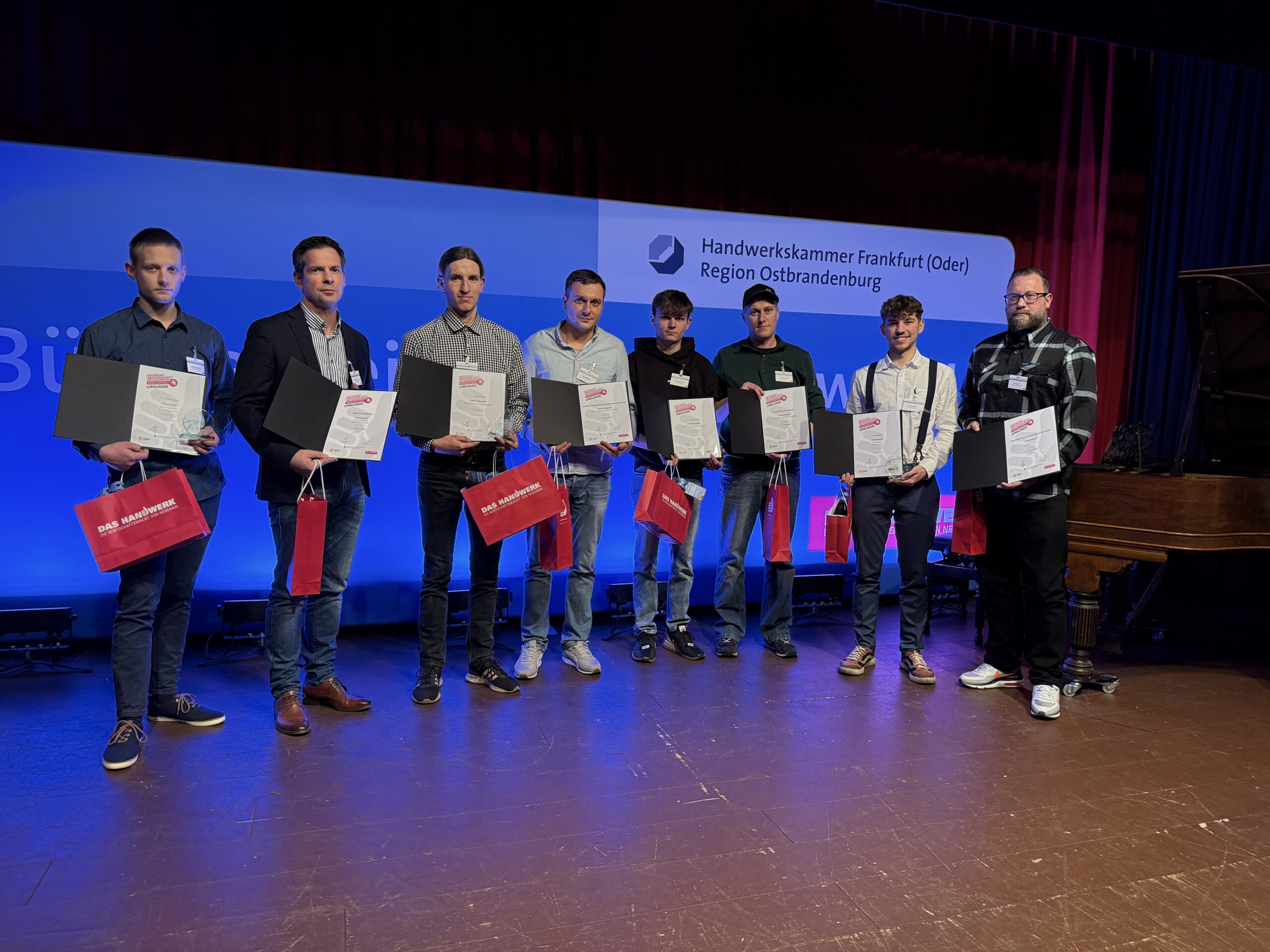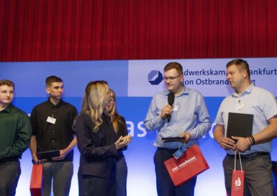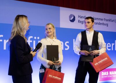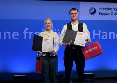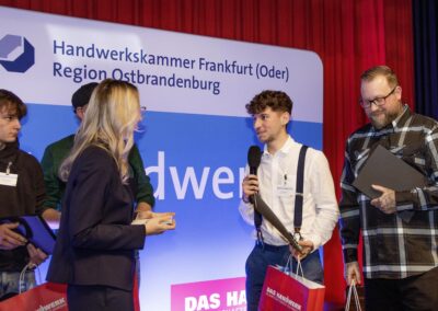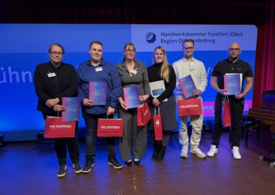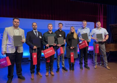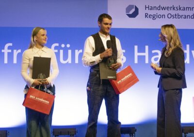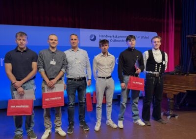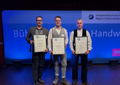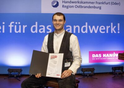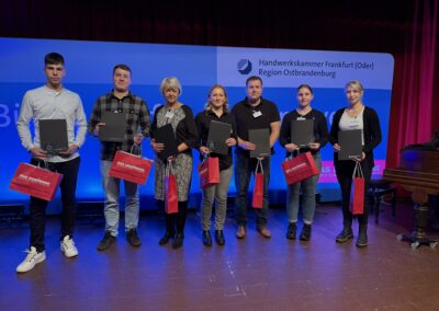 Insgesamt gab es 16 Kammersiegerinnen und Kammersieger, 18 Landessiegerinnen und Landessieger sowie mit Lilly Jahn von der Bäckerei Heidenreich eine Bundessiegerin im Bäckerhandwerk, mit Ludwig Benz von der Radfor GmbH in Melchow einen Bundessieger bei den Zimmerern und mit Lars Dietrich von Petersik Instruments aus Schöneiche den Bundessieger im Metallblasinstrumentenmacherhandwerk. Wir gratulieren!