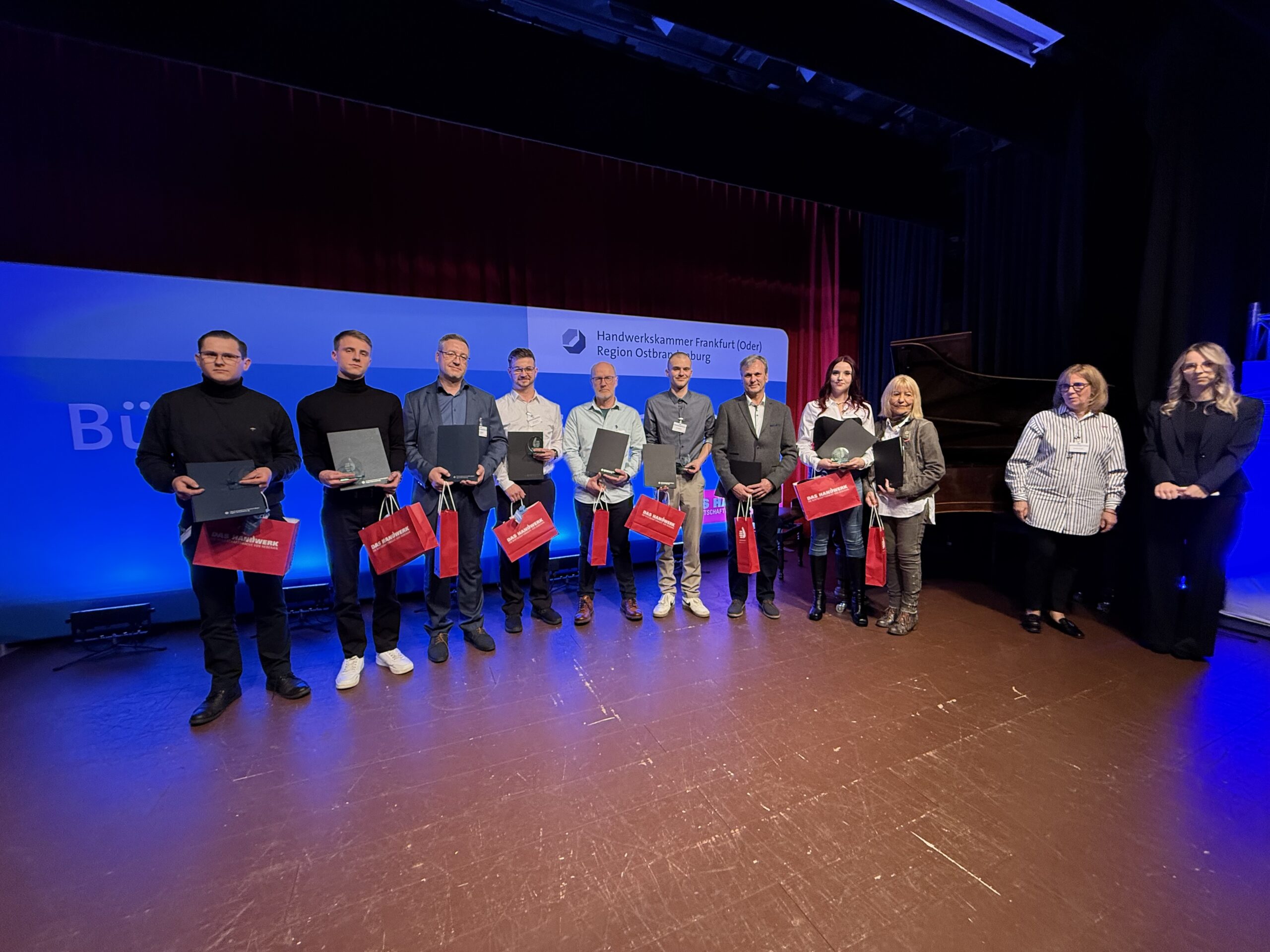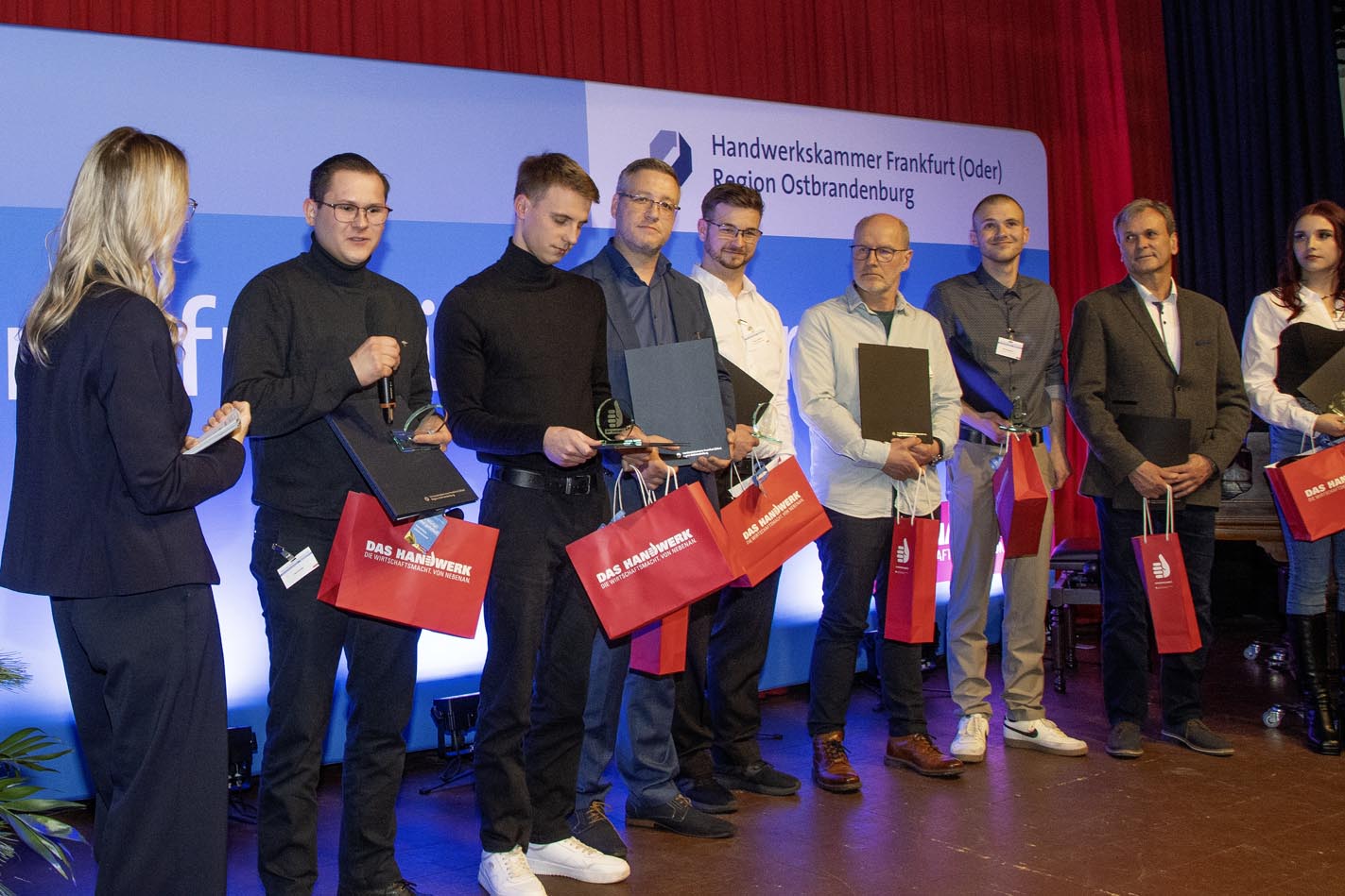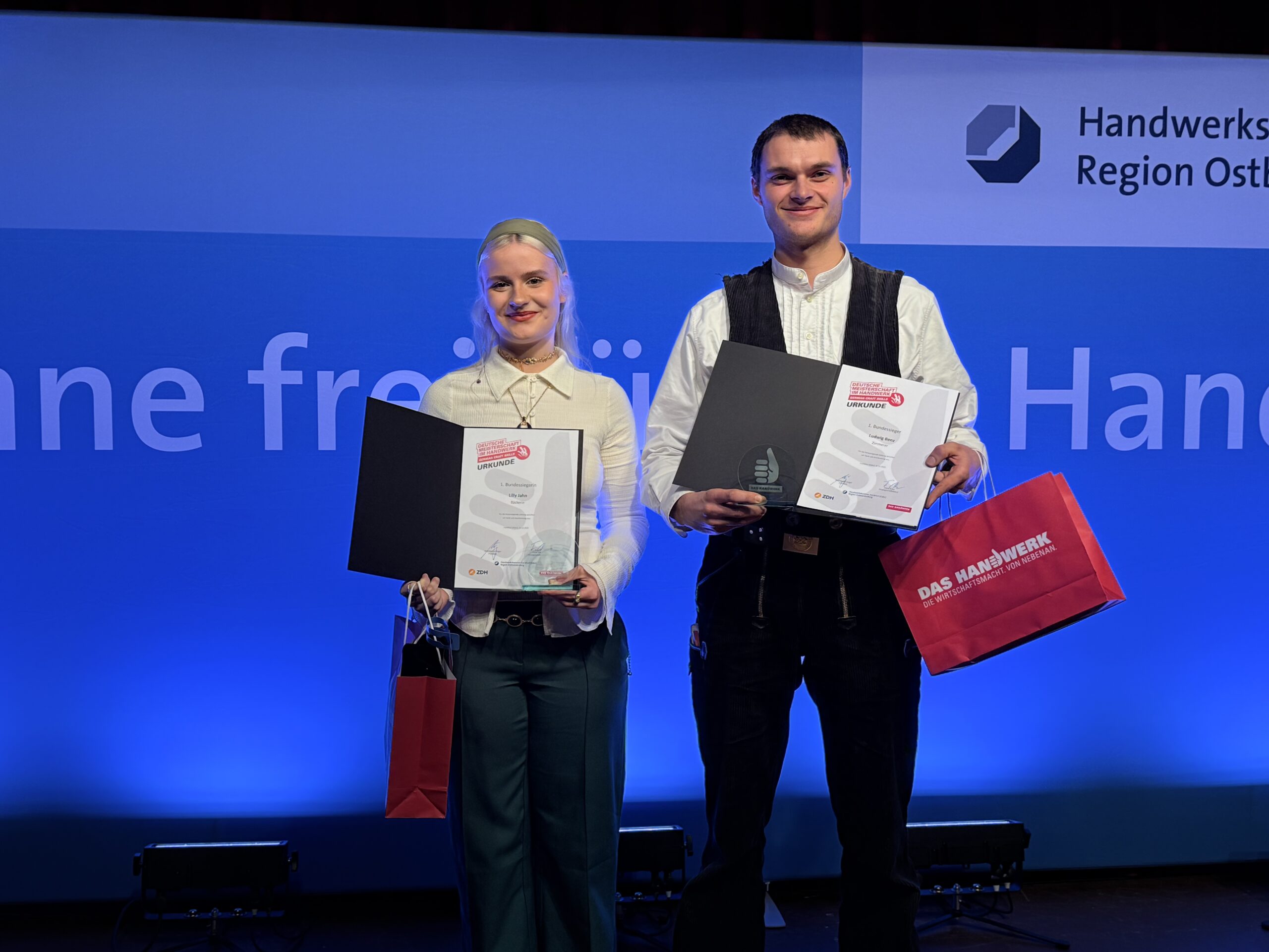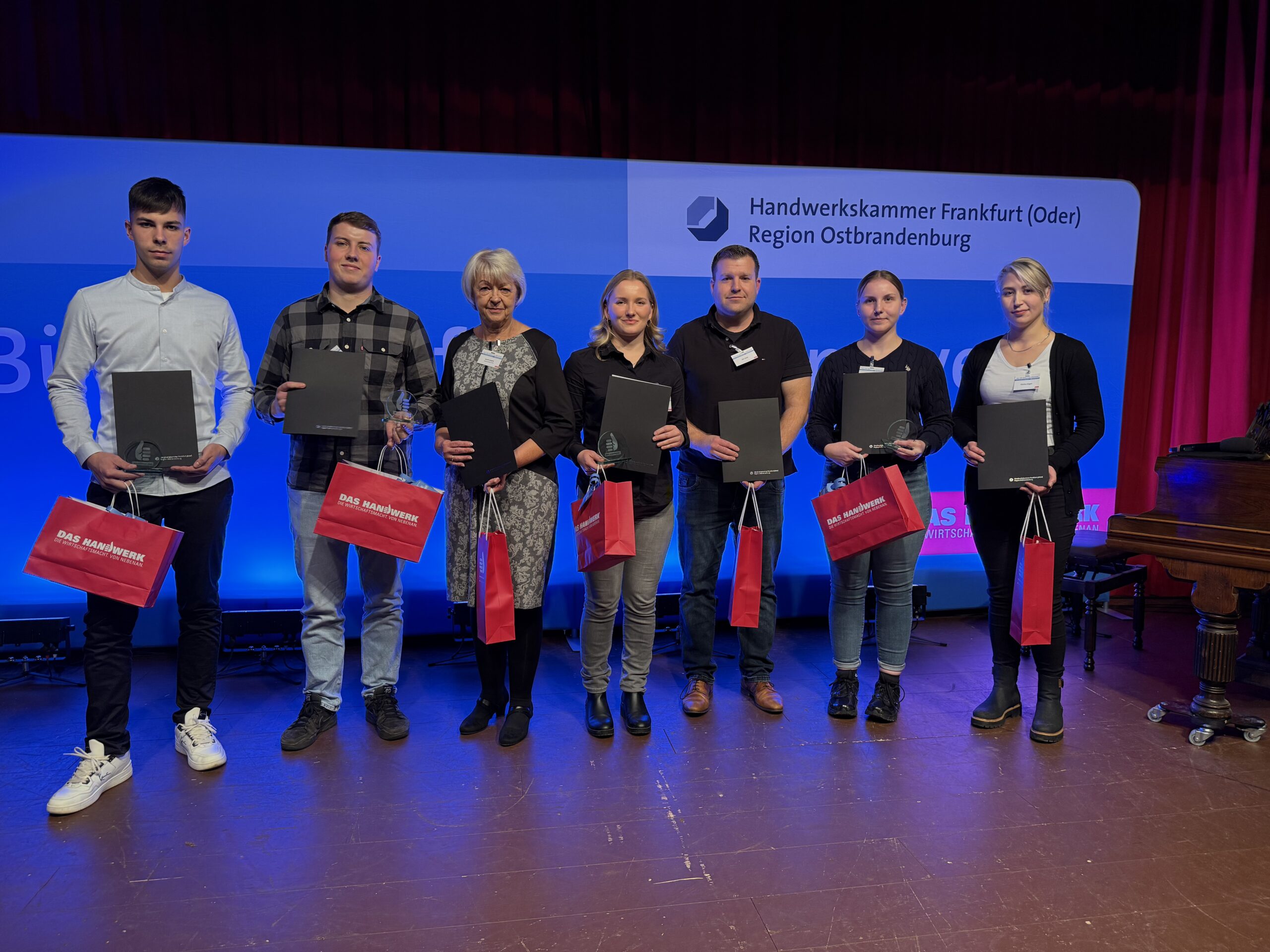 Insgesamt gab es 16 Kammersiegerinnen und Kammersieger, 18 Landessiegerinnen und Landessieger sowie mit Lilly Jahn von der Bäckerei Heidenreich eine Bundessiegerin im Bäckerhandwerk, mit Ludwig Benz von der Radfor GmbH in Melchow einen Bundessieger bei den Zimmerern und mit Lars Dietrich von Petersik Instruments aus Schöneiche den Bundessieger im Metallblasinstrumentenmacherhandwerk. Wir gratulieren!