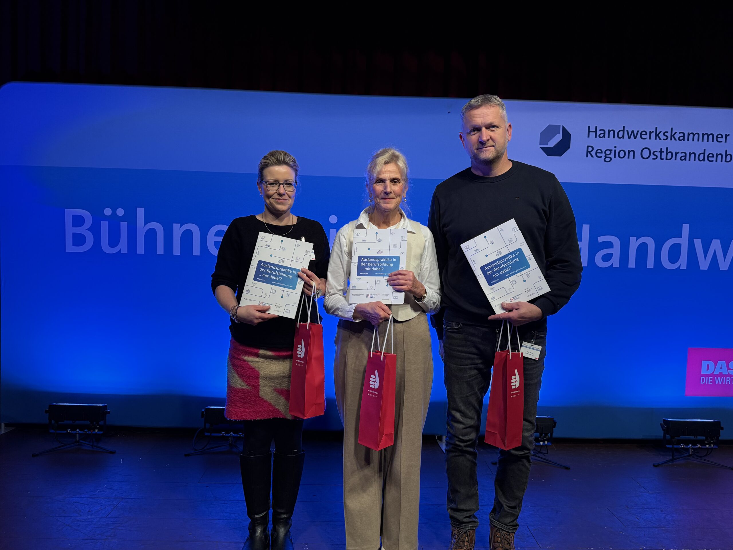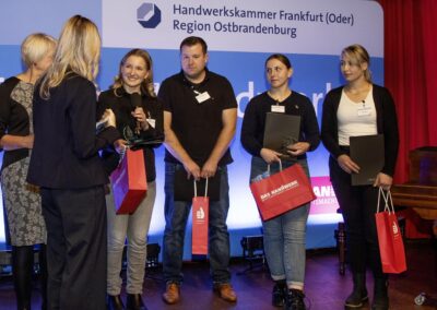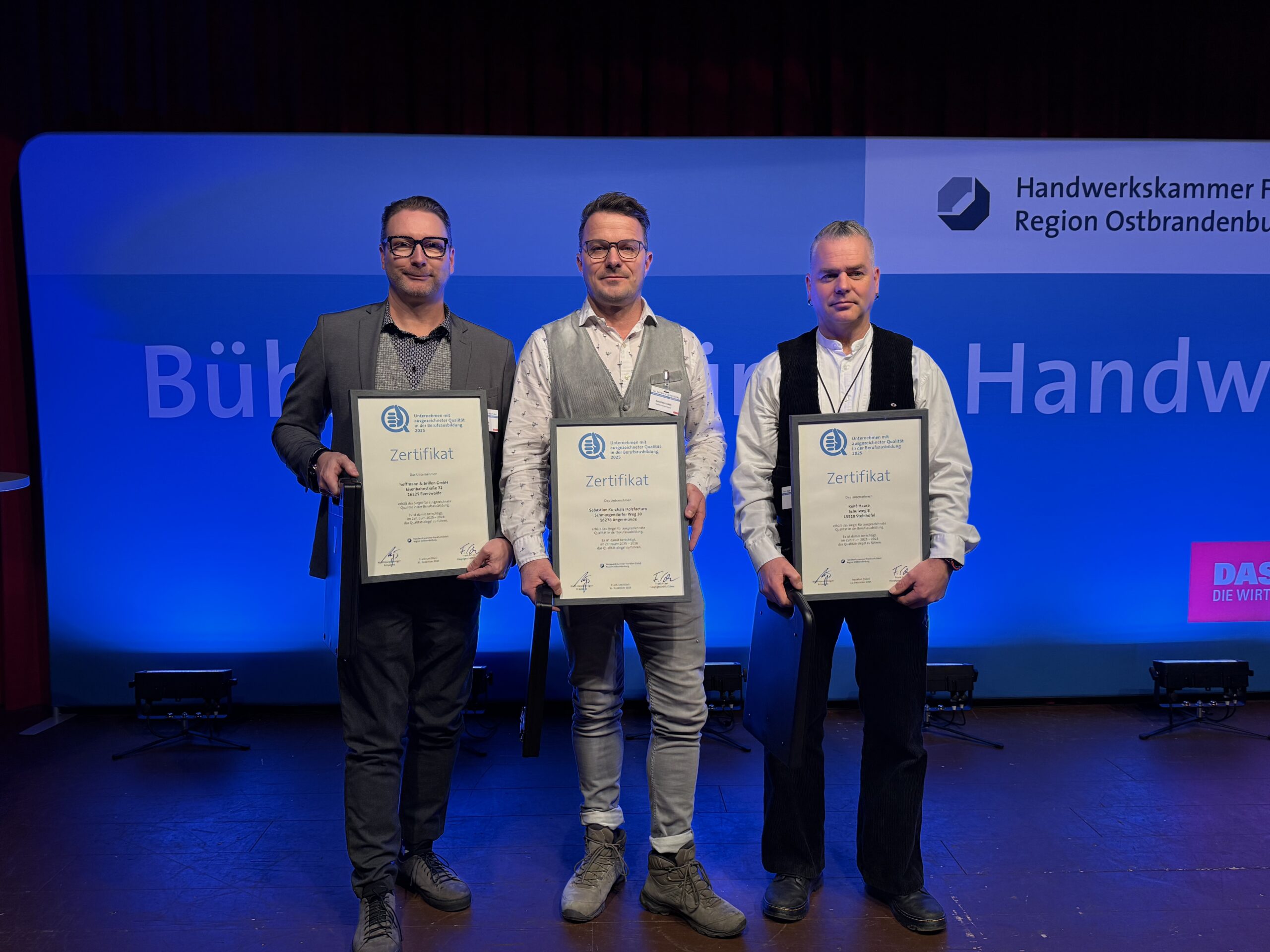 Mit der Hoffmann & Brillen GmbH, Eberswalde, der Tischlerei Stefan Kurzhals Holzfactura, dem Dachdeckerbetrieb René Haase aus Demnitz wurden auf der Veranstaltung drei Betriebe für ihre Verdienste und ihre Qualität in der Berufsausbildung geehrt. Ebenso erhielt die Retzlaff und Kramm Automotive GmbH aus Ahrensfelde, OT Blumberg in diesem Jahr das Gütesiegel. Gratulationen gab es auch für die ALPRO Metallbau GmbH, die in diesem Jahr den Brandenburgischen Ausbildungspreis gewonnen hat.
